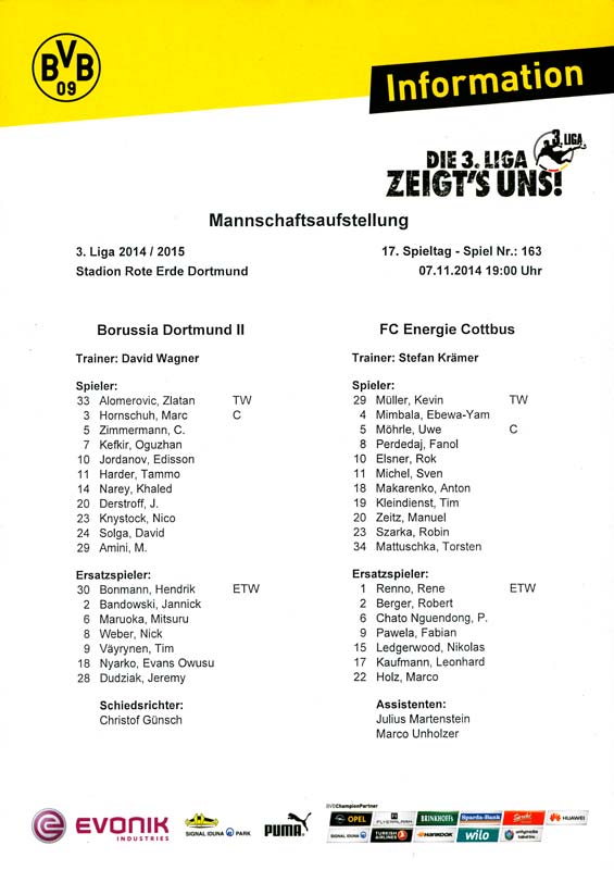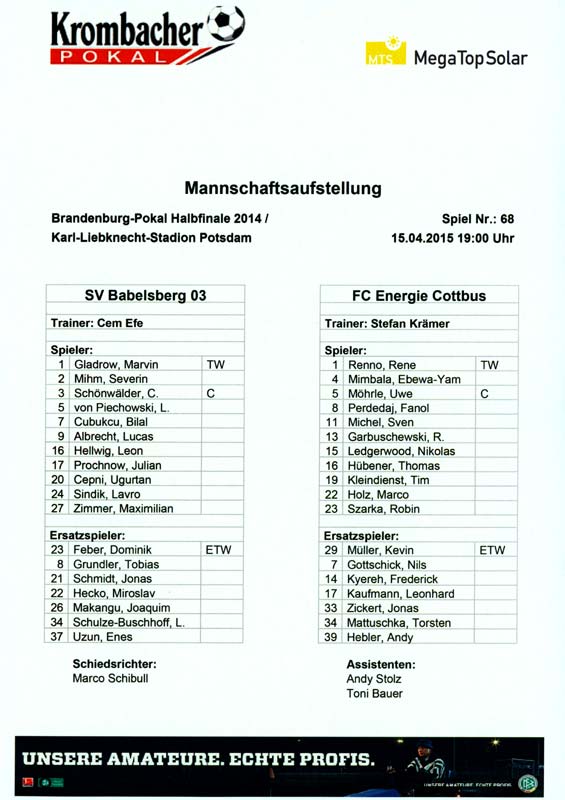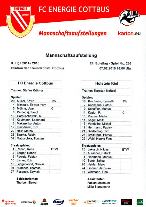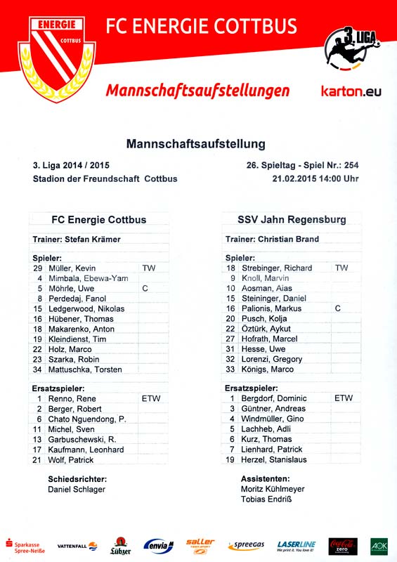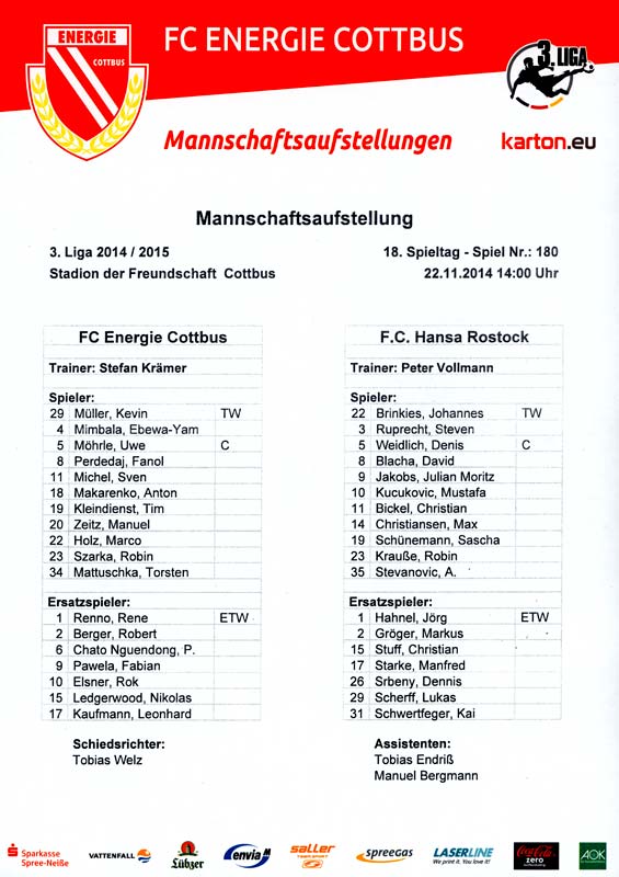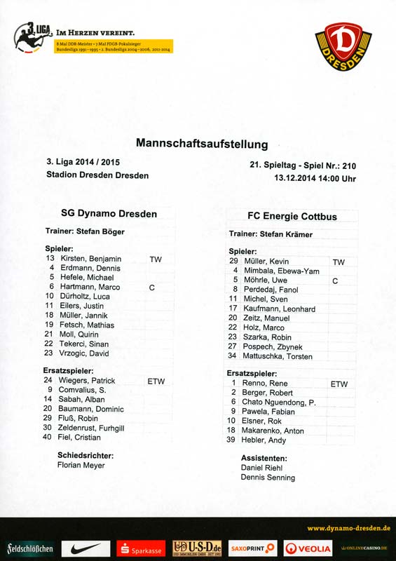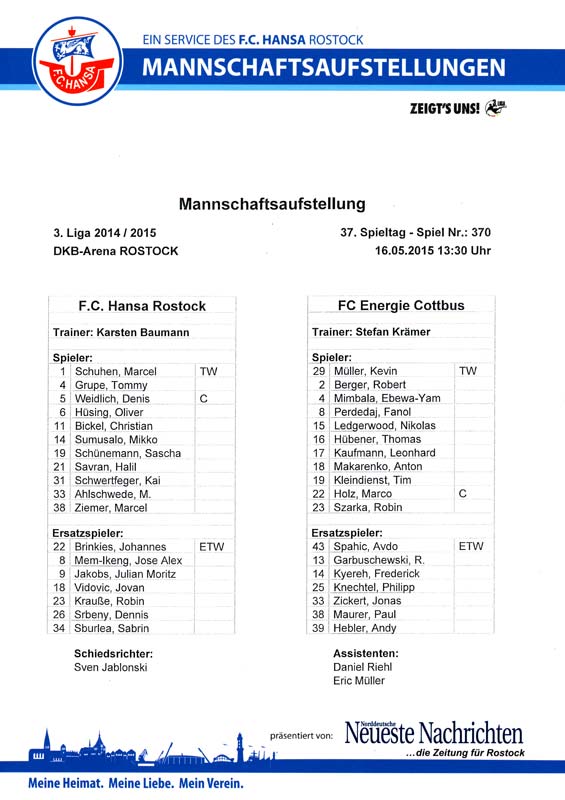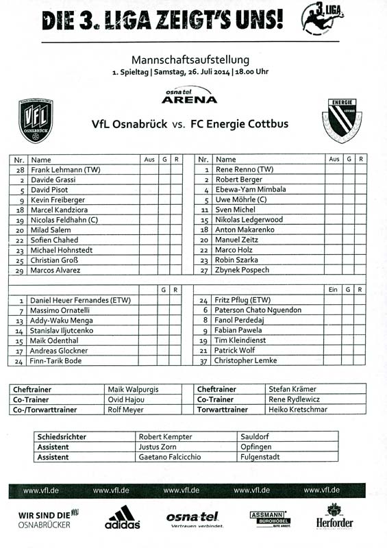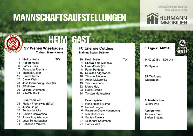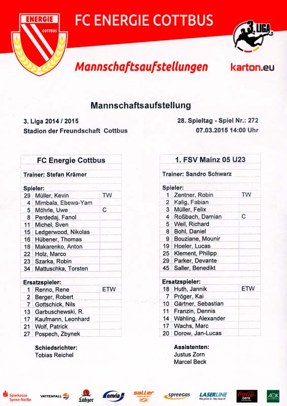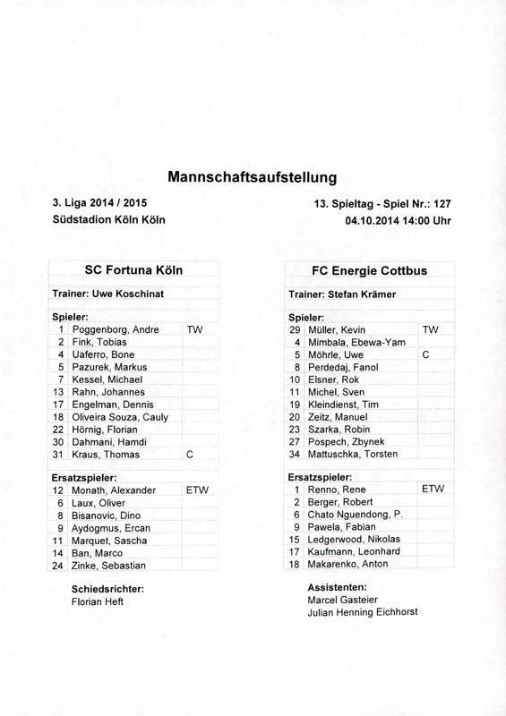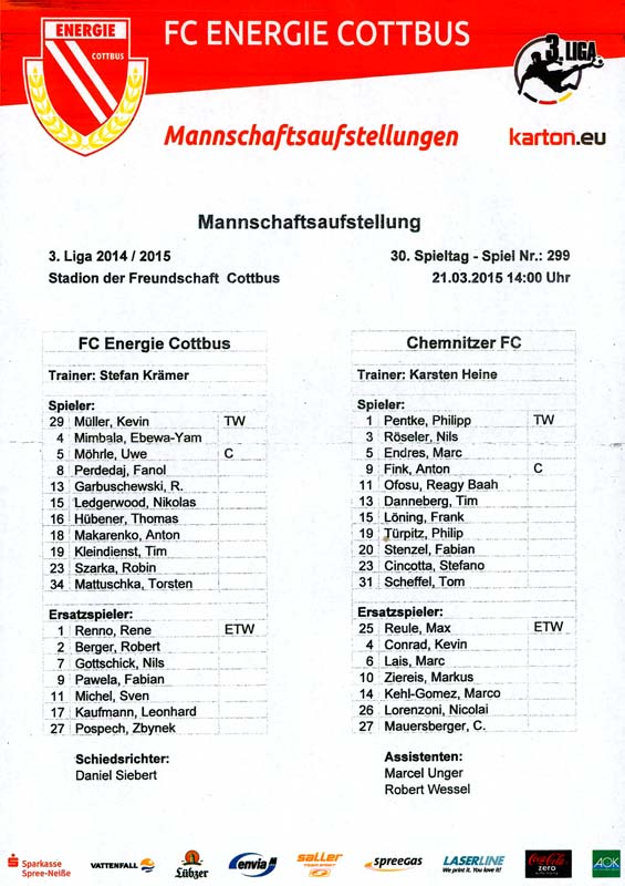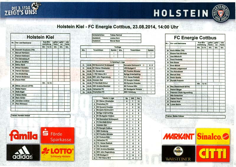 Presseinfos der 1. Mannschaft 02.07.2014, BSV Guben-Nord (A)06.07.2014, FC Lausitz Hoyerswerda (A)19.07.2014, 1. FC Magdeburg (H)26.07.2014, VfL Osnabrück 1899 (A)03.08.2014, SG Dynamo Dresden (H)06.08.2014, SC Preußen 06 Münster (A)09.08.2014, FC Rot-Weiß Erfurt (H)18.08.2014, Hamburger SV (H)23.08.2014, Kieler S.V. Holstein 1900 (A)26.08.2014, SV Wehen Wiesbaden 1926 (H)30.08.2014, SSV Jahn Regensburg (A)13.09.2014, 1. FSV Mainz 05 II (A)16.09.2014, SG Sonnenhof Großaspach (H)20.09.2014, Hallescher FC (H)23.09.2014, Chemnitzer FC (A)28.09.2014, DSC Arminia Bielefeld (H)04.10.2014, S.C. Fortuna Köln (A)12.10.2014, Ludwigsfelder FC (A)18.10.2014, MSV Duisburg (H)25.10.2014, SV Stuttgarter Kickers (A)01.11.2014, SpVgg Unterhaching 1925 (H)07.11.2014, BV Borussia 09 Dortmund II (A)15.11.2014, SV Grün-Weiß Brieselang (A)22.11.2014, F.C. Hansa Rostock (H)28.11.2014, VfB Stuttgart 1893 II (A)07.12.2014, VfL Osnabrück 1899 (H)13.12.2014, SG Dynamo Dresden (A)20.12.2014, SC Preußen 06 Münster (H)16.01.2015, Hertha BSC (A)23.01.2015, Hertha BSC II (H)31.01.2015, FC Rot-Weiß Erfurt (A)07.02.2015, Kieler S.V. Holstein 1900 (H)14.02.2015, SV Wehen Wiesbaden 1926 (A)21.02.2015, SSV Jahn Regensburg (H)28.02.2015, SG Sonnenhof Großaspach (A)07.03.2015, 1. FSV Mainz 05 II (H)14.03.2015, Hallescher FC (A)21.03.2015, Chemnitzer FC (H)11.04.2015, S.C. Fortuna Köln (H)15.04.2015, SV Babelsberg 03 (A)25.04.2015, SV Stuttgarter Kickers (H)02.05.2015, SpVgg Unterhaching 1925 (A)06.05.2015, FSV Union Fürstenwalde (A)16.05.2015, F.C. Hansa Rostock (A)23.05.2015, VfB Stuttgart 1893 II (H)