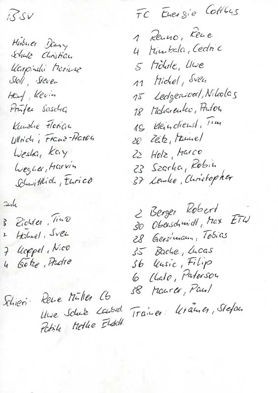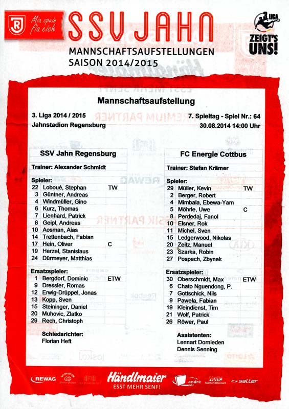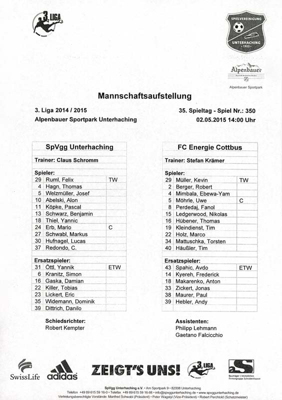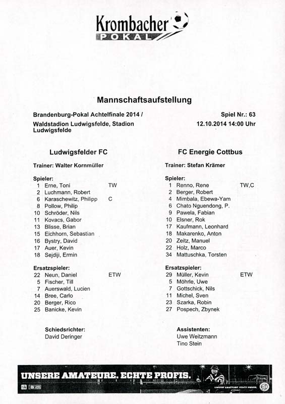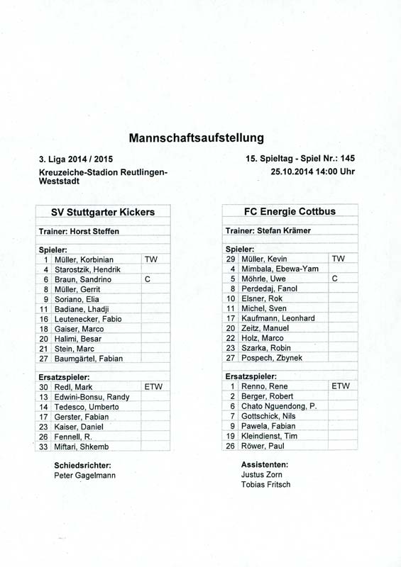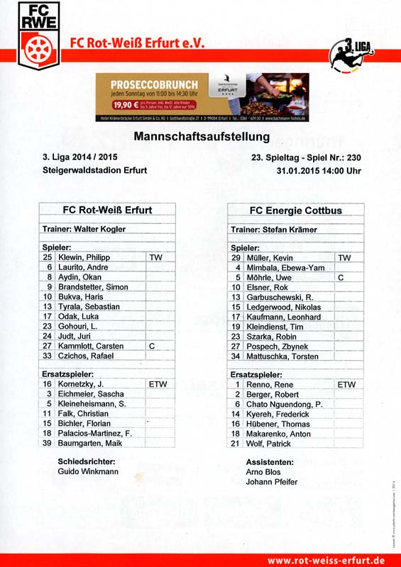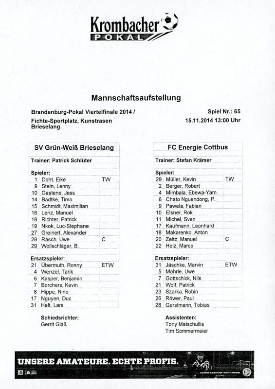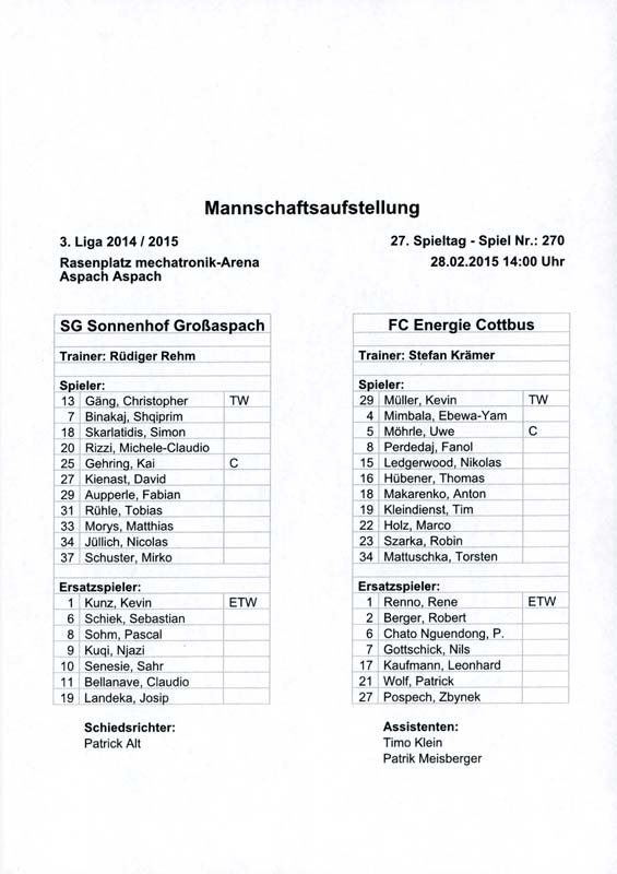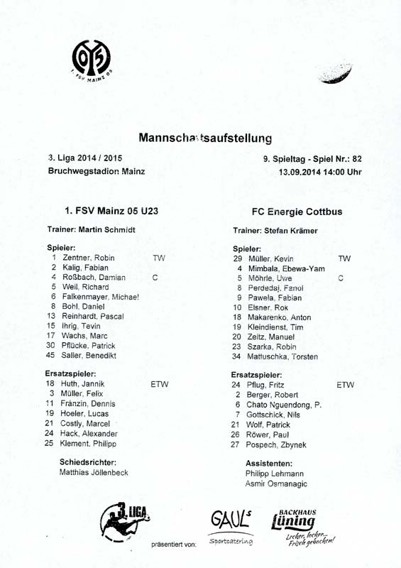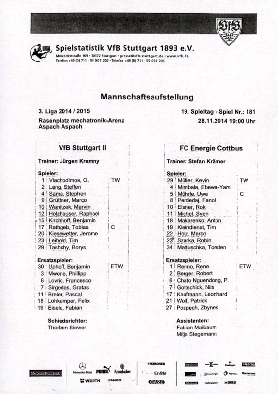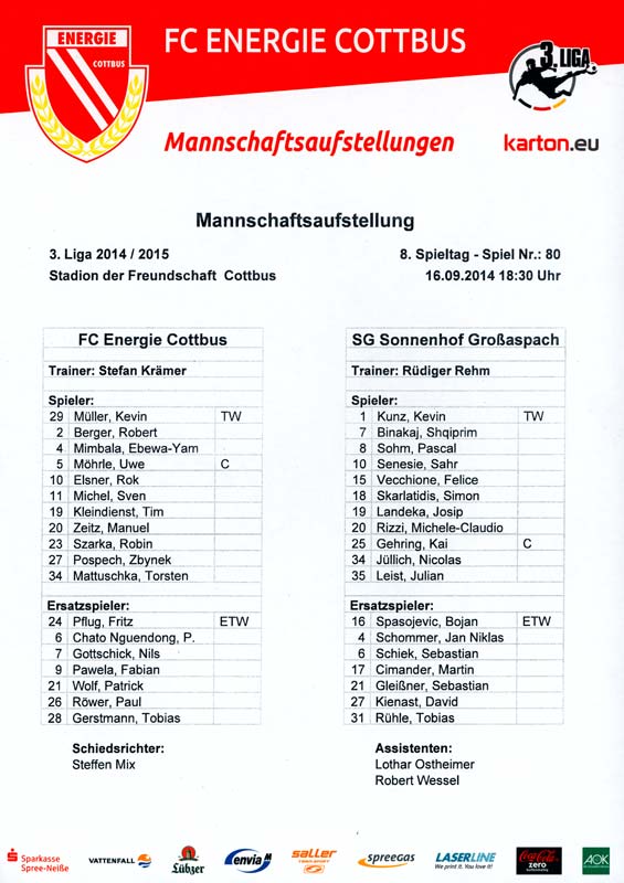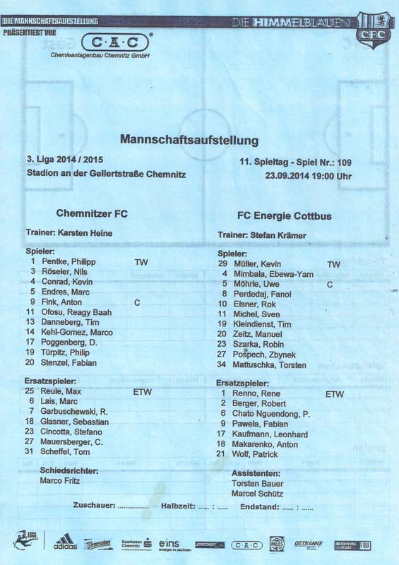 Presseinfos der 1. Mannschaft 02.07.2014, BSV Guben-Nord (A)06.07.2014, FC Lausitz Hoyerswerda (A)19.07.2014, 1. FC Magdeburg (H)26.07.2014, VfL Osnabrück 1899 (A)03.08.2014, SG Dynamo Dresden (H)06.08.2014, SC Preußen 06 Münster (A)09.08.2014, FC Rot-Weiß Erfurt (H)18.08.2014, Hamburger SV (H)23.08.2014, Kieler S.V. Holstein 1900 (A)26.08.2014, SV Wehen Wiesbaden 1926 (H)30.08.2014, SSV Jahn Regensburg (A)13.09.2014, 1. FSV Mainz 05 II (A)16.09.2014, SG Sonnenhof Großaspach (H)20.09.2014, Hallescher FC (H)23.09.2014, Chemnitzer FC (A)28.09.2014, DSC Arminia Bielefeld (H)04.10.2014, S.C. Fortuna Köln (A)12.10.2014, Ludwigsfelder FC (A)18.10.2014, MSV Duisburg (H)25.10.2014, SV Stuttgarter Kickers (A)01.11.2014, SpVgg Unterhaching 1925 (H)07.11.2014, BV Borussia 09 Dortmund II (A)15.11.2014, SV Grün-Weiß Brieselang (A)22.11.2014, F.C. Hansa Rostock (H)28.11.2014, VfB Stuttgart 1893 II (A)07.12.2014, VfL Osnabrück 1899 (H)13.12.2014, SG Dynamo Dresden (A)20.12.2014, SC Preußen 06 Münster (H)16.01.2015, Hertha BSC (A)23.01.2015, Hertha BSC II (H)31.01.2015, FC Rot-Weiß Erfurt (A)07.02.2015, Kieler S.V. Holstein 1900 (H)14.02.2015, SV Wehen Wiesbaden 1926 (A)21.02.2015, SSV Jahn Regensburg (H)28.02.2015, SG Sonnenhof Großaspach (A)07.03.2015, 1. FSV Mainz 05 II (H)14.03.2015, Hallescher FC (A)21.03.2015, Chemnitzer FC (H)11.04.2015, S.C. Fortuna Köln (H)15.04.2015, SV Babelsberg 03 (A)25.04.2015, SV Stuttgarter Kickers (H)02.05.2015, SpVgg Unterhaching 1925 (A)06.05.2015, FSV Union Fürstenwalde (A)16.05.2015, F.C. Hansa Rostock (A)23.05.2015, VfB Stuttgart 1893 II (H)