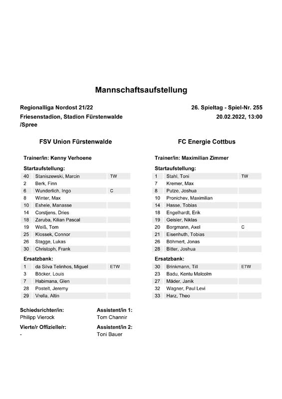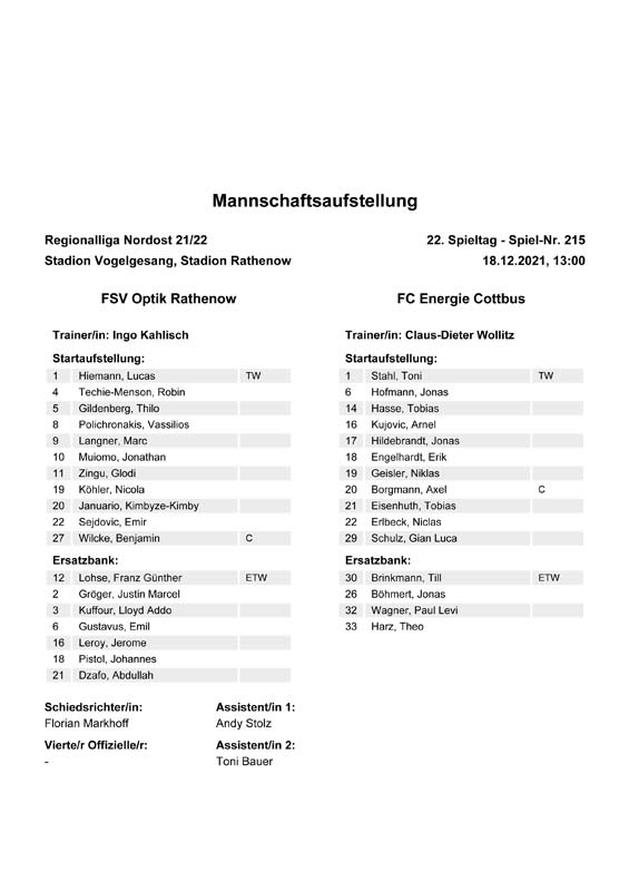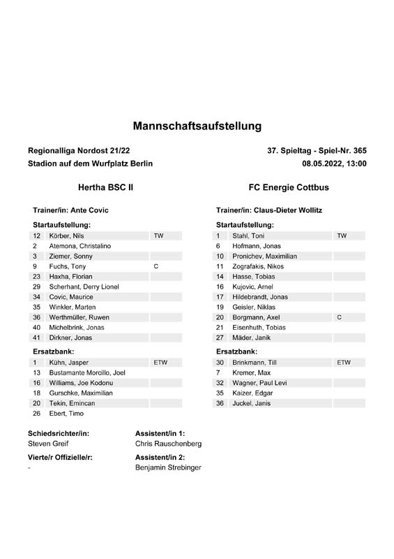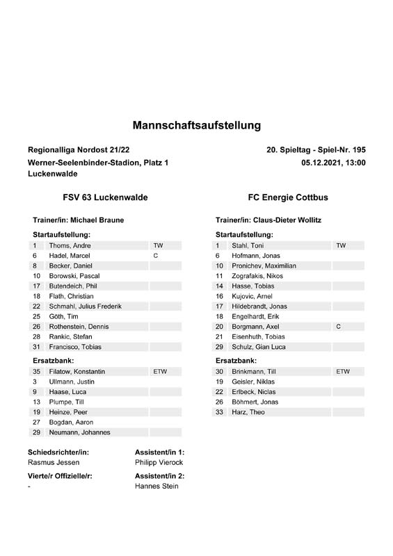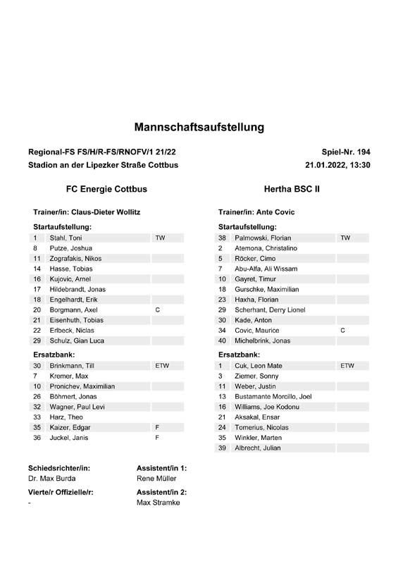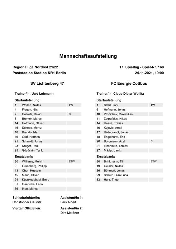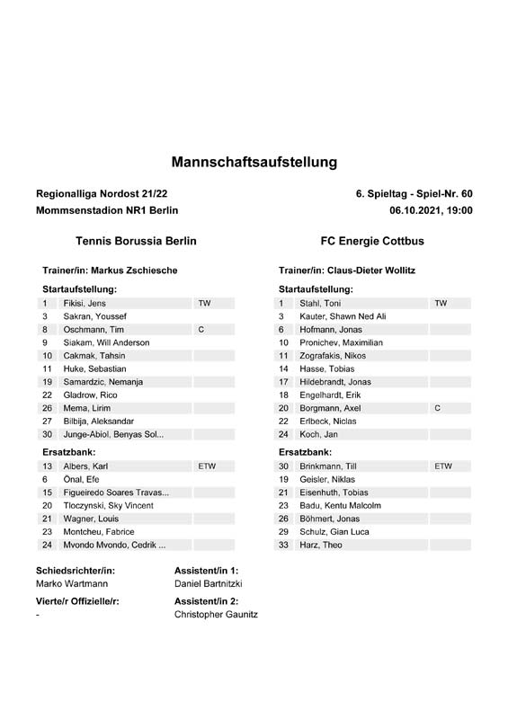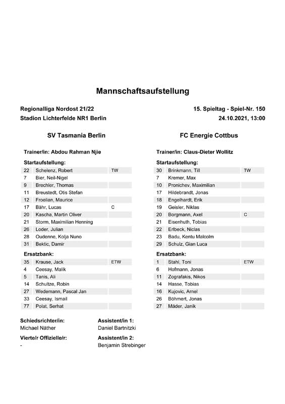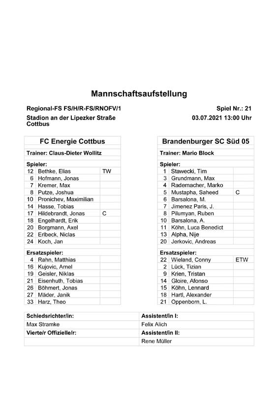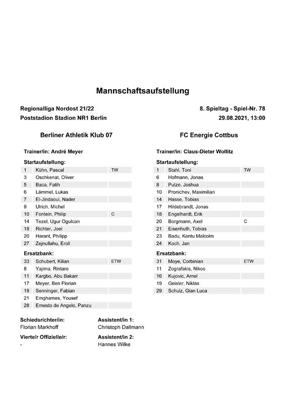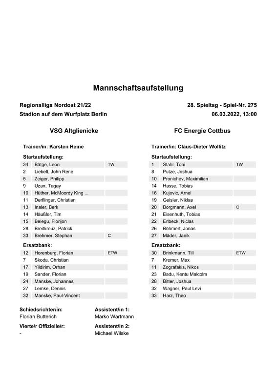 Presseinfos der 1. Mannschaft 19.06.2021, SG Groß Gaglow (A)23.06.2021, SV Wacker 09 Cottbus-Ströbitz (A)26.06.2021, Ludwigsfelder FC (A)03.07.2021, Brandenburger SC Süd 05 (H)11.07.2021, SV Lichtenberg 47 (A)17.07.2021, TSV Havelse 1912 (A)25.07.2021, FSV 63 Luckenwalde (H)28.07.2021, BFC Dynamo (A)02.08.2021, FSV Optik Rathenow (H)06.08.2021, Offenbacher FC Kickers 1901 (H)14.08.2021, VfB Auerbach 1906 (H)21.08.2021, FSV Union Fürstenwalde (H)29.08.2021, Berliner AK 07 (A)01.09.2021, VSG Altglienicke (H)04.09.2021, Ludwigsfelder FC (A)25.09.2021, FC Eilenburg (H)01.10.2021, VfB Germania Halberstadt (A)06.10.2021, Tennis Borussia Berlin (A)09.10.2021, FSV Optik Rathenow (A)16.10.2021, ZFC Meuselwitz (H)20.10.2021, Chemnitzer FC (A)24.10.2021, SV Tasmania Berlin (A)27.10.2021, FC Carl Zeiss Jena (A)31.10.2021, SV Babelsberg 03 (H)10.11.2021, 1. FC Lokomotive Leipzig (A)13.11.2021, Fortuna Babelsberg (H)20.11.2021, Hertha BSC II (H)24.11.2021, SV Lichtenberg 47 (A)27.11.2021, BSG Chemie Leipzig (A)05.12.2021, FSV 63 Luckenwalde (A)10.12.2021, BFC Dynamo (H)18.12.2021, FSV Optik Rathenow (A)12.01.2022, SV Wacker 09 Cottbus-Ströbitz (H)21.01.2022, Hertha BSC II (H)29.01.2022, FC Carl Zeiss Jena (H)05.02.2022, VfB Auerbach 1906 (A)20.02.2022, FSV Union Fürstenwalde (A)26.02.2022, Berliner AK 07 (H)06.03.2022, VSG Altglienicke (A)20.03.2022, Chemnitzer FC (H)26.03.2022, SV Babelsberg 03 (H)30.03.2022, Tennis Borussia Berlin (H)03.04.2022, FC Eilenburg (A)06.04.2022, VfB Germania Halberstadt (H)10.04.2022, ZFC Meuselwitz (A)14.04.2022, SV Tasmania Berlin (H)19.04.2022, 1. FC Lokomotive Leipzig (H)23.04.2022, SV Babelsberg 03 (A)01.05.2022, SV Lichtenberg 47 (H)08.05.2022, Hertha BSC II (A)15.05.2022, BSG Chemie Leipzig (H)21.05.2022, VfB 1921 Krieschow (N)