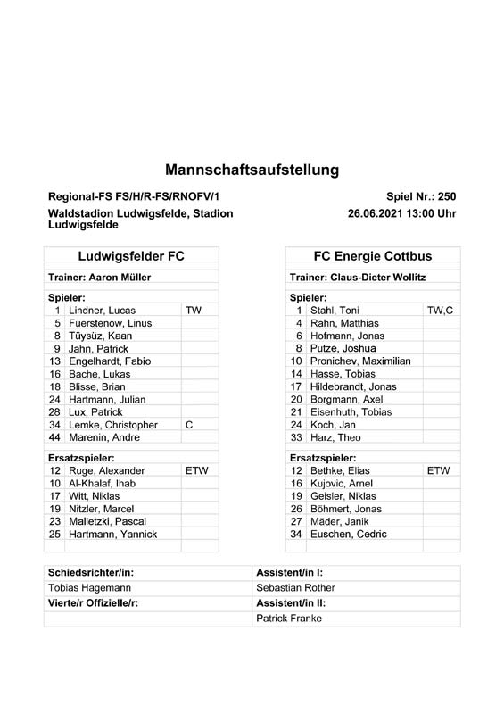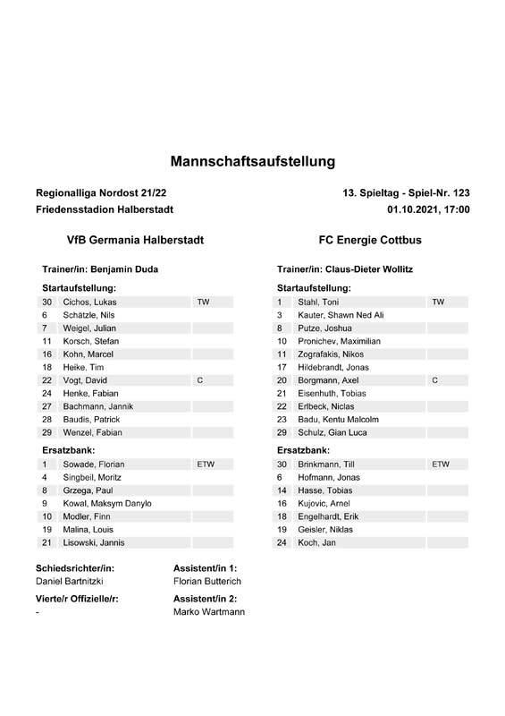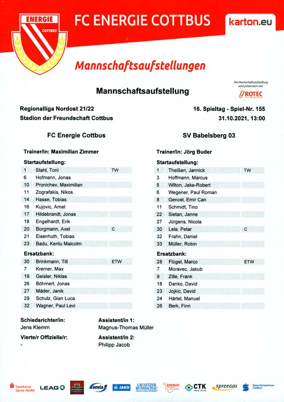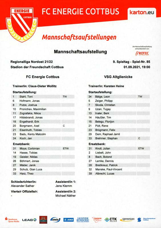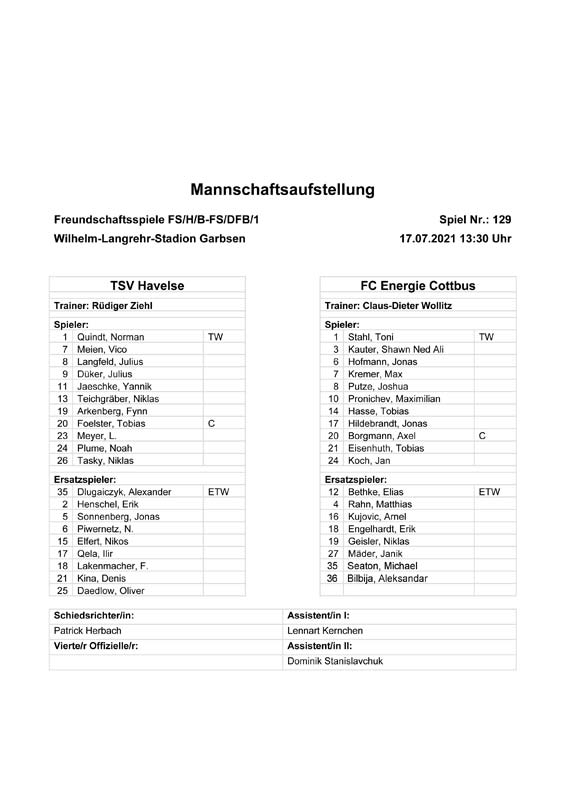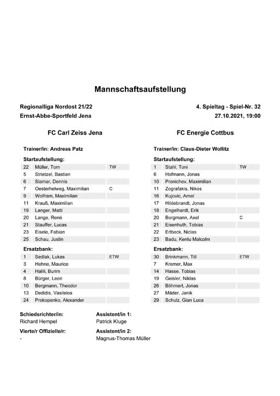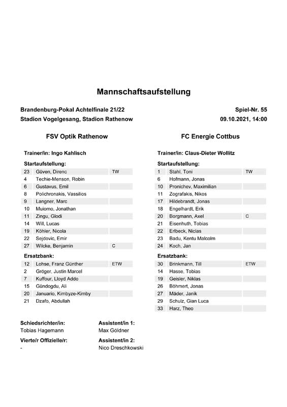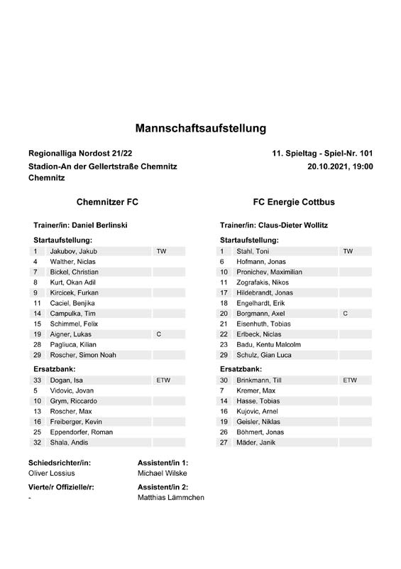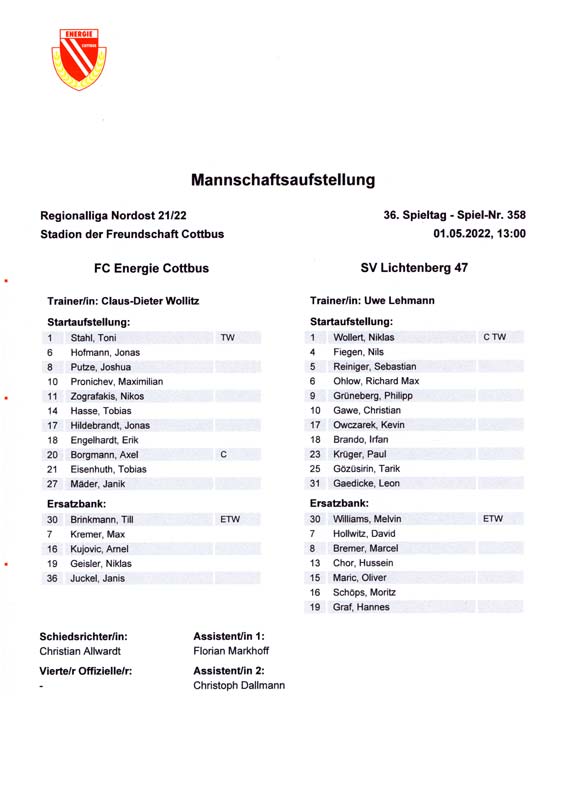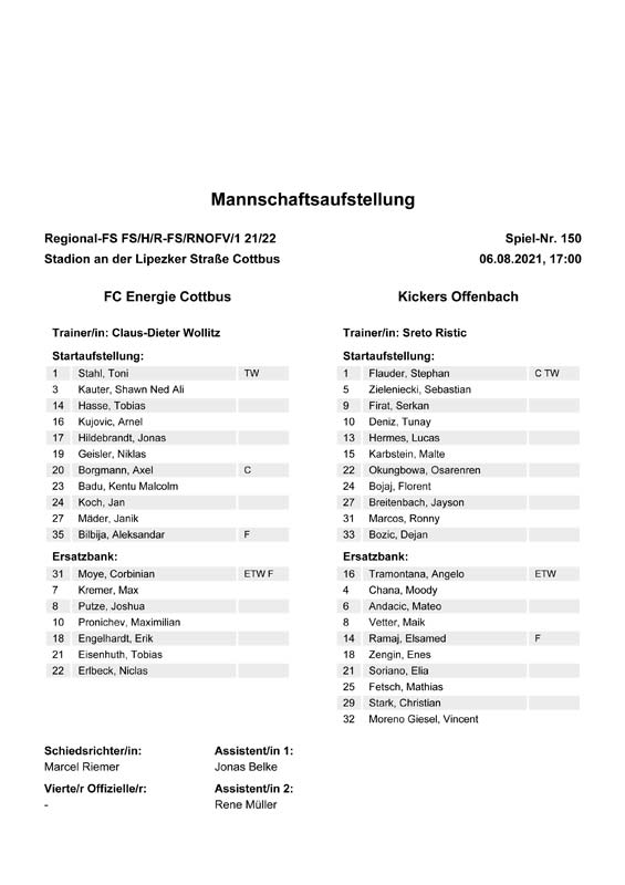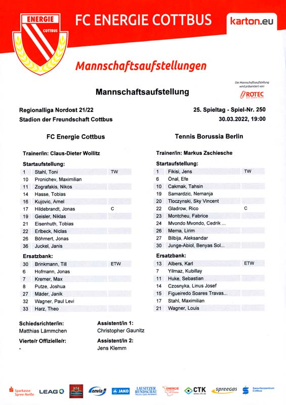 Presseinfos der 1. Mannschaft 19.06.2021, SG Groß Gaglow (A)23.06.2021, SV Wacker 09 Cottbus-Ströbitz (A)26.06.2021, Ludwigsfelder FC (A)03.07.2021, Brandenburger SC Süd 05 (H)11.07.2021, SV Lichtenberg 47 (A)17.07.2021, TSV Havelse 1912 (A)25.07.2021, FSV 63 Luckenwalde (H)28.07.2021, BFC Dynamo (A)02.08.2021, FSV Optik Rathenow (H)06.08.2021, Offenbacher FC Kickers 1901 (H)14.08.2021, VfB Auerbach 1906 (H)21.08.2021, FSV Union Fürstenwalde (H)29.08.2021, Berliner AK 07 (A)01.09.2021, VSG Altglienicke (H)04.09.2021, Ludwigsfelder FC (A)25.09.2021, FC Eilenburg (H)01.10.2021, VfB Germania Halberstadt (A)06.10.2021, Tennis Borussia Berlin (A)09.10.2021, FSV Optik Rathenow (A)16.10.2021, ZFC Meuselwitz (H)20.10.2021, Chemnitzer FC (A)24.10.2021, SV Tasmania Berlin (A)27.10.2021, FC Carl Zeiss Jena (A)31.10.2021, SV Babelsberg 03 (H)10.11.2021, 1. FC Lokomotive Leipzig (A)13.11.2021, Fortuna Babelsberg (H)20.11.2021, Hertha BSC II (H)24.11.2021, SV Lichtenberg 47 (A)27.11.2021, BSG Chemie Leipzig (A)05.12.2021, FSV 63 Luckenwalde (A)10.12.2021, BFC Dynamo (H)18.12.2021, FSV Optik Rathenow (A)12.01.2022, SV Wacker 09 Cottbus-Ströbitz (H)21.01.2022, Hertha BSC II (H)29.01.2022, FC Carl Zeiss Jena (H)05.02.2022, VfB Auerbach 1906 (A)20.02.2022, FSV Union Fürstenwalde (A)26.02.2022, Berliner AK 07 (H)06.03.2022, VSG Altglienicke (A)20.03.2022, Chemnitzer FC (H)26.03.2022, SV Babelsberg 03 (H)30.03.2022, Tennis Borussia Berlin (H)03.04.2022, FC Eilenburg (A)06.04.2022, VfB Germania Halberstadt (H)10.04.2022, ZFC Meuselwitz (A)14.04.2022, SV Tasmania Berlin (H)19.04.2022, 1. FC Lokomotive Leipzig (H)23.04.2022, SV Babelsberg 03 (A)01.05.2022, SV Lichtenberg 47 (H)08.05.2022, Hertha BSC II (A)15.05.2022, BSG Chemie Leipzig (H)21.05.2022, VfB 1921 Krieschow (N)
