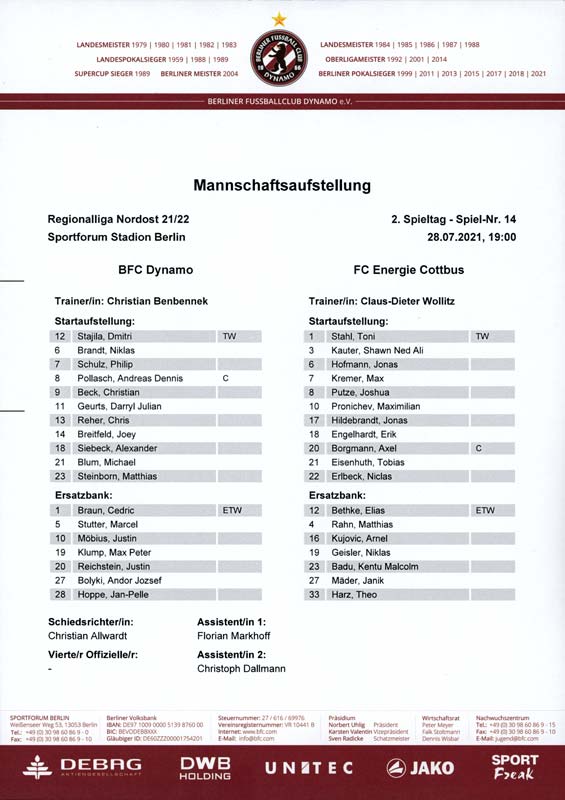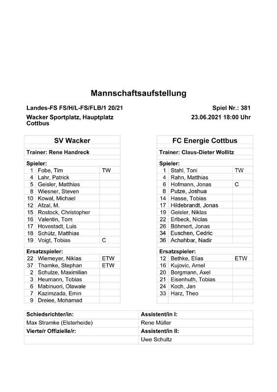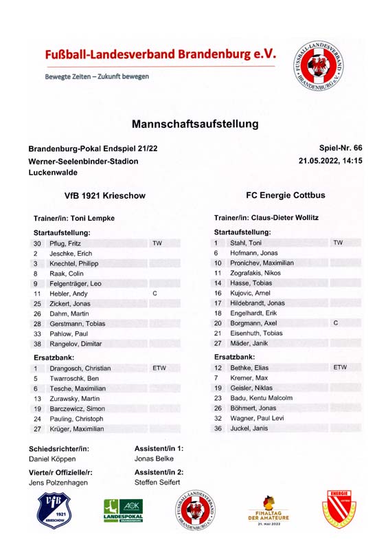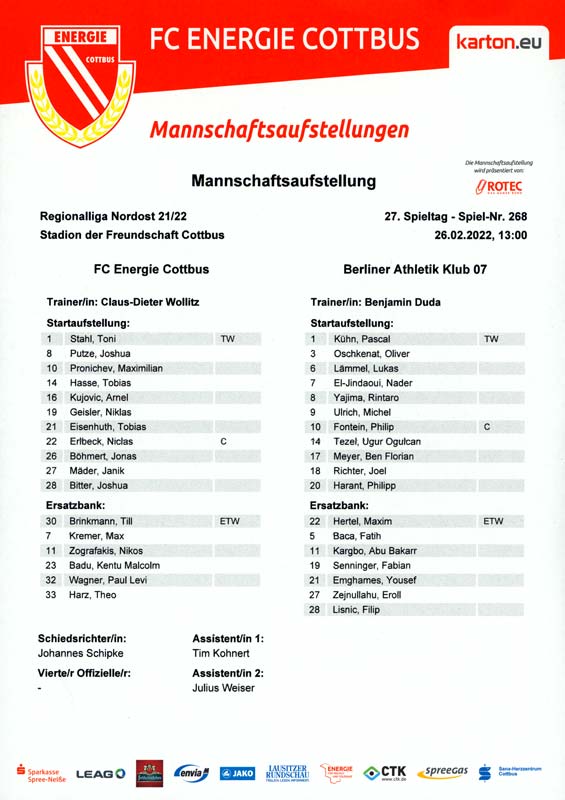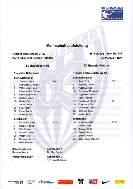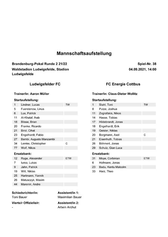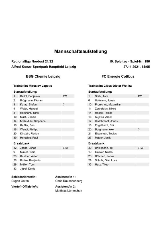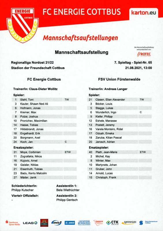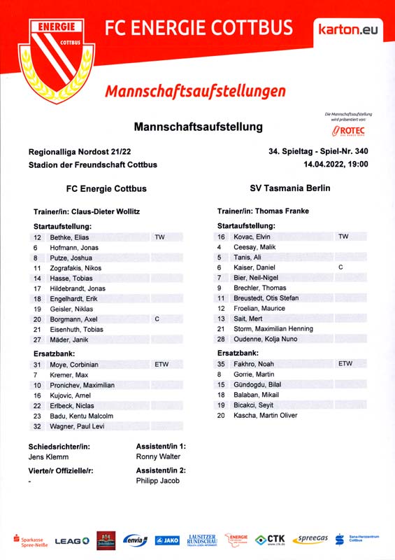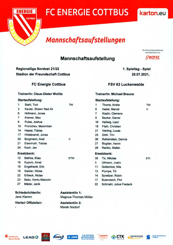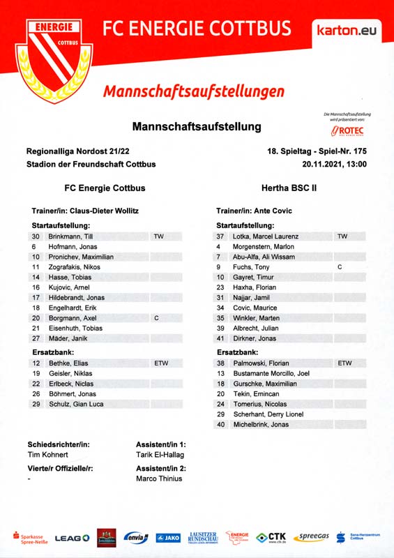 Presseinfos der 1. Mannschaft 19.06.2021, SG Groß Gaglow (A)23.06.2021, SV Wacker 09 Cottbus-Ströbitz (A)26.06.2021, Ludwigsfelder FC (A)03.07.2021, Brandenburger SC Süd 05 (H)11.07.2021, SV Lichtenberg 47 (A)17.07.2021, TSV Havelse 1912 (A)25.07.2021, FSV 63 Luckenwalde (H)28.07.2021, BFC Dynamo (A)02.08.2021, FSV Optik Rathenow (H)06.08.2021, Offenbacher FC Kickers 1901 (H)14.08.2021, VfB Auerbach 1906 (H)21.08.2021, FSV Union Fürstenwalde (H)29.08.2021, Berliner AK 07 (A)01.09.2021, VSG Altglienicke (H)04.09.2021, Ludwigsfelder FC (A)25.09.2021, FC Eilenburg (H)01.10.2021, VfB Germania Halberstadt (A)06.10.2021, Tennis Borussia Berlin (A)09.10.2021, FSV Optik Rathenow (A)16.10.2021, ZFC Meuselwitz (H)20.10.2021, Chemnitzer FC (A)24.10.2021, SV Tasmania Berlin (A)27.10.2021, FC Carl Zeiss Jena (A)31.10.2021, SV Babelsberg 03 (H)10.11.2021, 1. FC Lokomotive Leipzig (A)13.11.2021, Fortuna Babelsberg (H)20.11.2021, Hertha BSC II (H)24.11.2021, SV Lichtenberg 47 (A)27.11.2021, BSG Chemie Leipzig (A)05.12.2021, FSV 63 Luckenwalde (A)10.12.2021, BFC Dynamo (H)18.12.2021, FSV Optik Rathenow (A)12.01.2022, SV Wacker 09 Cottbus-Ströbitz (H)21.01.2022, Hertha BSC II (H)29.01.2022, FC Carl Zeiss Jena (H)05.02.2022, VfB Auerbach 1906 (A)20.02.2022, FSV Union Fürstenwalde (A)26.02.2022, Berliner AK 07 (H)06.03.2022, VSG Altglienicke (A)20.03.2022, Chemnitzer FC (H)26.03.2022, SV Babelsberg 03 (H)30.03.2022, Tennis Borussia Berlin (H)03.04.2022, FC Eilenburg (A)06.04.2022, VfB Germania Halberstadt (H)10.04.2022, ZFC Meuselwitz (A)14.04.2022, SV Tasmania Berlin (H)19.04.2022, 1. FC Lokomotive Leipzig (H)23.04.2022, SV Babelsberg 03 (A)01.05.2022, SV Lichtenberg 47 (H)08.05.2022, Hertha BSC II (A)15.05.2022, BSG Chemie Leipzig (H)21.05.2022, VfB 1921 Krieschow (N)