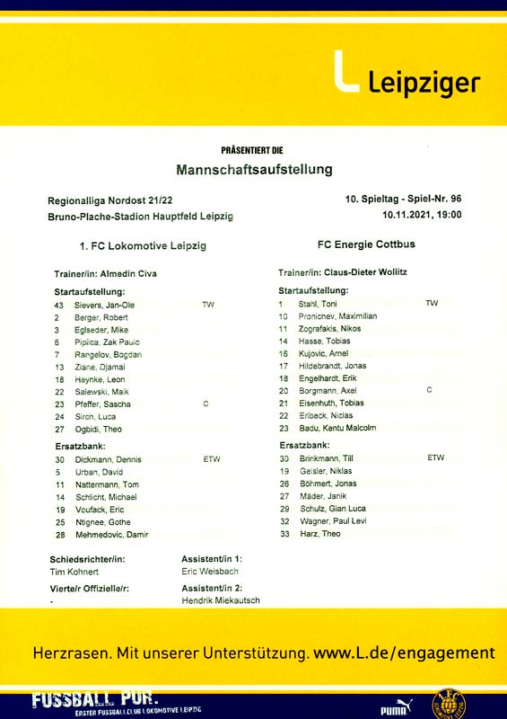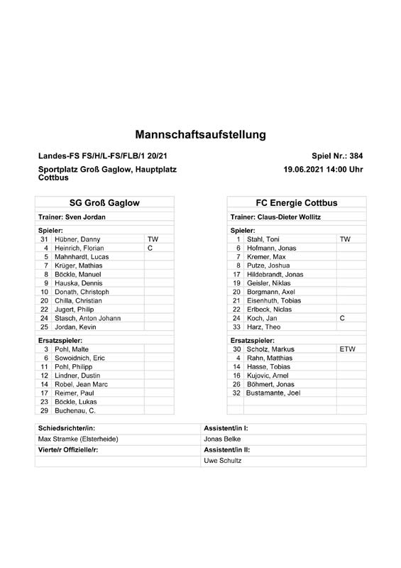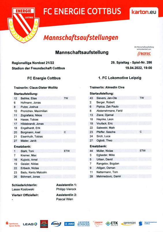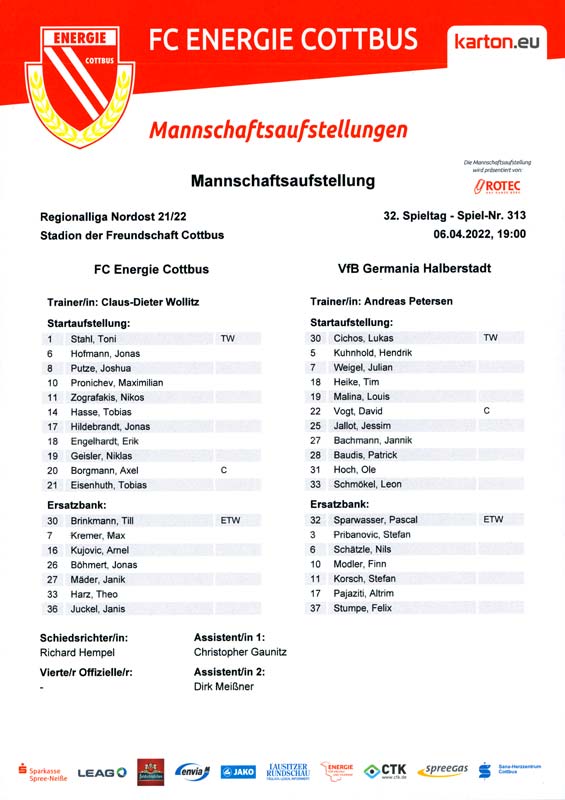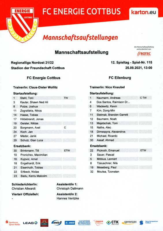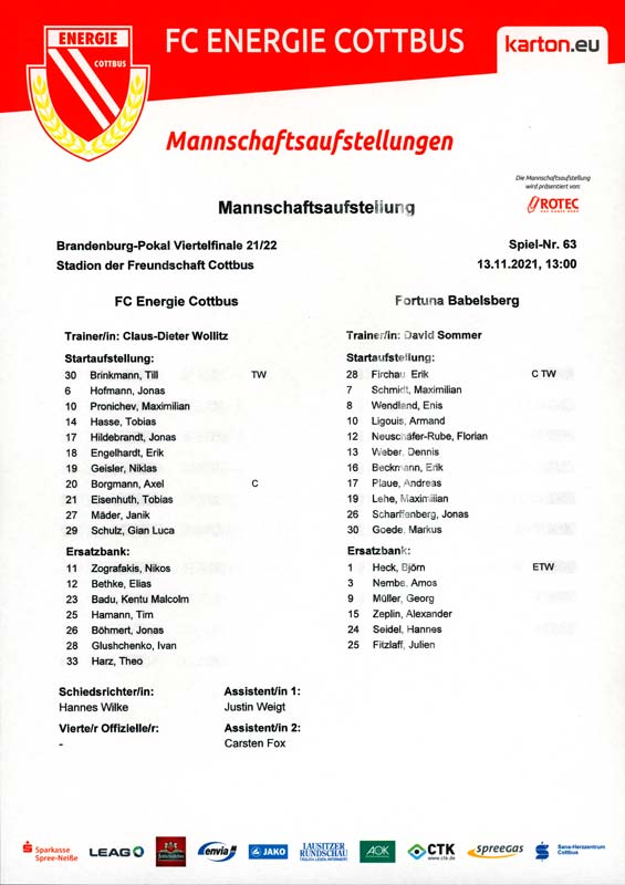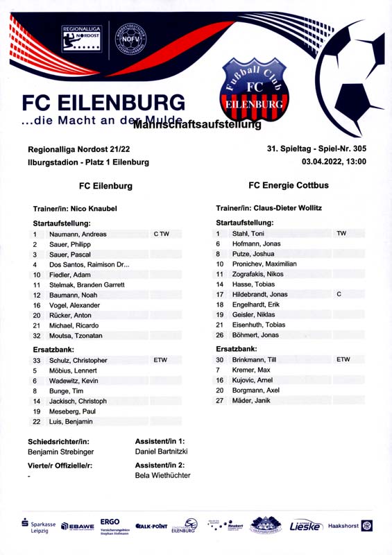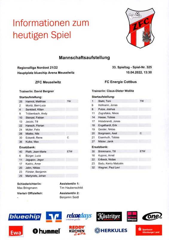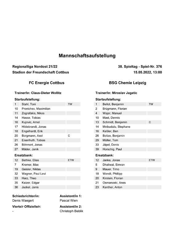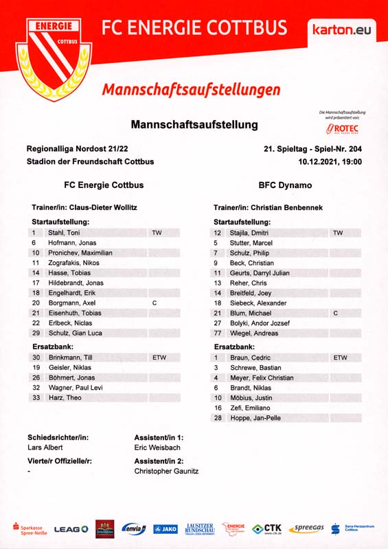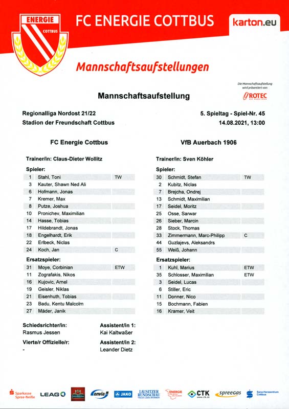 Presseinfos der 1. Mannschaft 19.06.2021, SG Groß Gaglow (A)23.06.2021, SV Wacker 09 Cottbus-Ströbitz (A)26.06.2021, Ludwigsfelder FC (A)03.07.2021, Brandenburger SC Süd 05 (H)11.07.2021, SV Lichtenberg 47 (A)17.07.2021, TSV Havelse 1912 (A)25.07.2021, FSV 63 Luckenwalde (H)28.07.2021, BFC Dynamo (A)02.08.2021, FSV Optik Rathenow (H)06.08.2021, Offenbacher FC Kickers 1901 (H)14.08.2021, VfB Auerbach 1906 (H)21.08.2021, FSV Union Fürstenwalde (H)29.08.2021, Berliner AK 07 (A)01.09.2021, VSG Altglienicke (H)04.09.2021, Ludwigsfelder FC (A)25.09.2021, FC Eilenburg (H)01.10.2021, VfB Germania Halberstadt (A)06.10.2021, Tennis Borussia Berlin (A)09.10.2021, FSV Optik Rathenow (A)16.10.2021, ZFC Meuselwitz (H)20.10.2021, Chemnitzer FC (A)24.10.2021, SV Tasmania Berlin (A)27.10.2021, FC Carl Zeiss Jena (A)31.10.2021, SV Babelsberg 03 (H)10.11.2021, 1. FC Lokomotive Leipzig (A)13.11.2021, Fortuna Babelsberg (H)20.11.2021, Hertha BSC II (H)24.11.2021, SV Lichtenberg 47 (A)27.11.2021, BSG Chemie Leipzig (A)05.12.2021, FSV 63 Luckenwalde (A)10.12.2021, BFC Dynamo (H)18.12.2021, FSV Optik Rathenow (A)12.01.2022, SV Wacker 09 Cottbus-Ströbitz (H)21.01.2022, Hertha BSC II (H)29.01.2022, FC Carl Zeiss Jena (H)05.02.2022, VfB Auerbach 1906 (A)20.02.2022, FSV Union Fürstenwalde (A)26.02.2022, Berliner AK 07 (H)06.03.2022, VSG Altglienicke (A)20.03.2022, Chemnitzer FC (H)26.03.2022, SV Babelsberg 03 (H)30.03.2022, Tennis Borussia Berlin (H)03.04.2022, FC Eilenburg (A)06.04.2022, VfB Germania Halberstadt (H)10.04.2022, ZFC Meuselwitz (A)14.04.2022, SV Tasmania Berlin (H)19.04.2022, 1. FC Lokomotive Leipzig (H)23.04.2022, SV Babelsberg 03 (A)01.05.2022, SV Lichtenberg 47 (H)08.05.2022, Hertha BSC II (A)15.05.2022, BSG Chemie Leipzig (H)21.05.2022, VfB 1921 Krieschow (N)