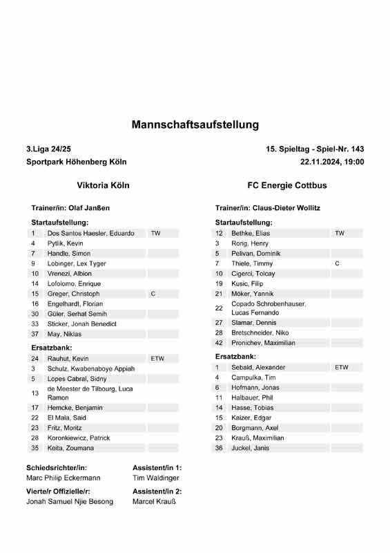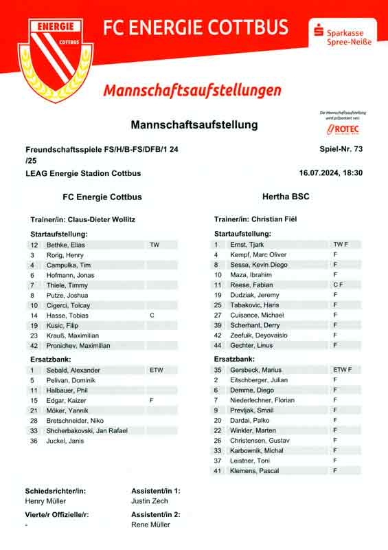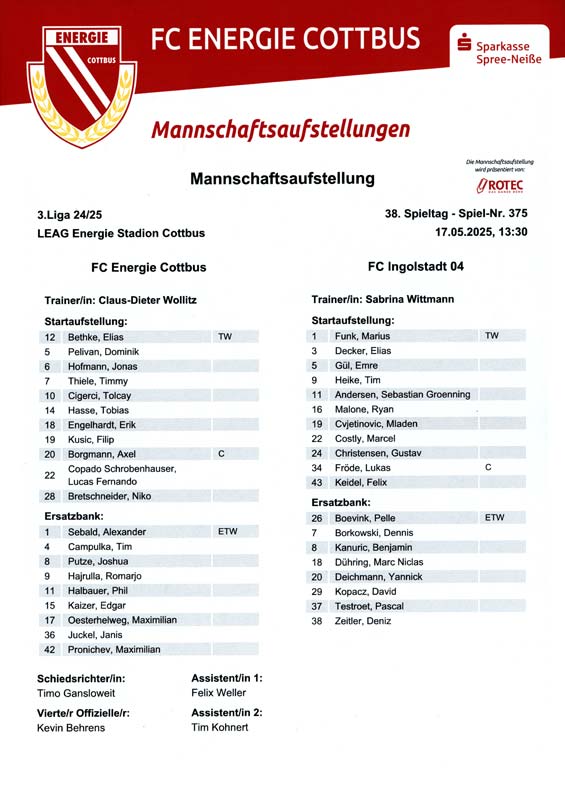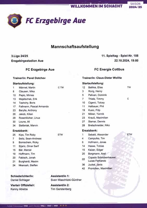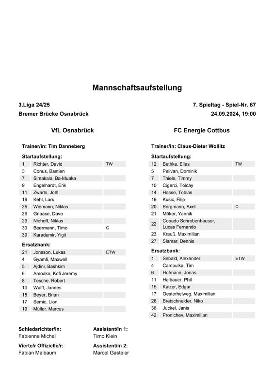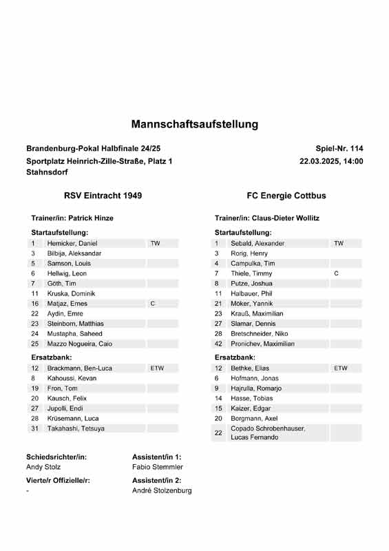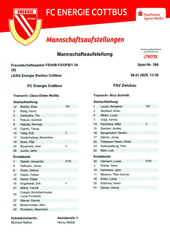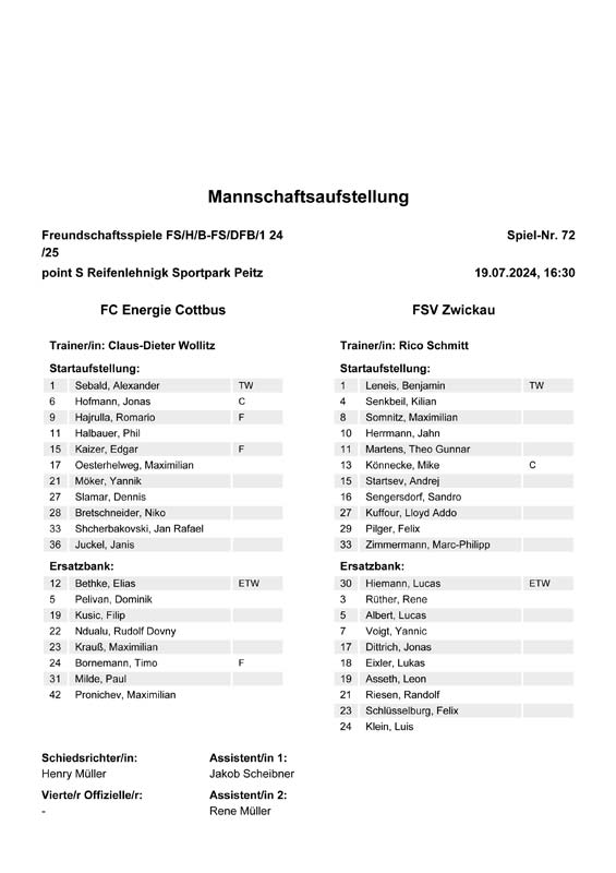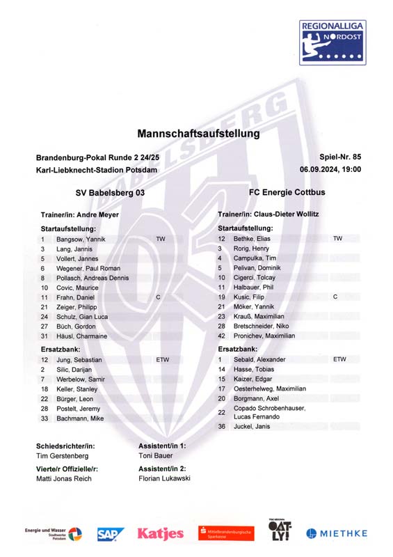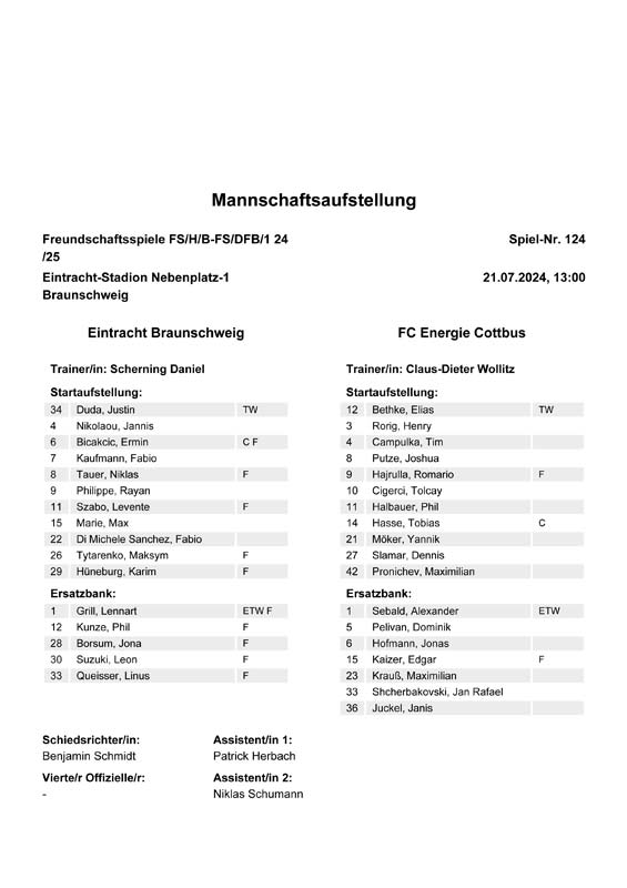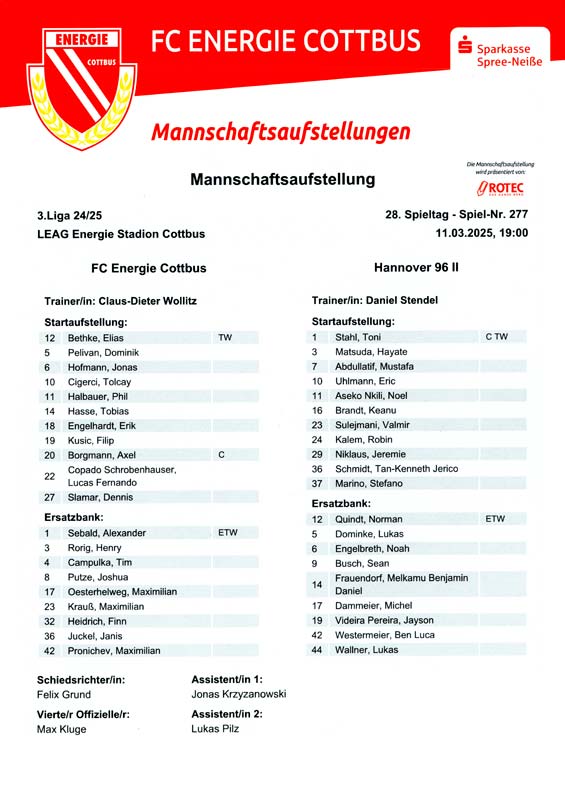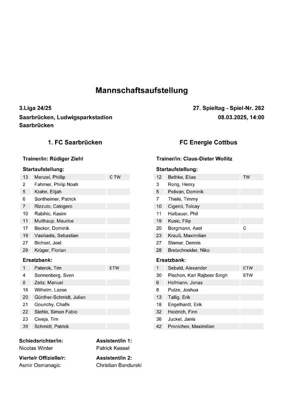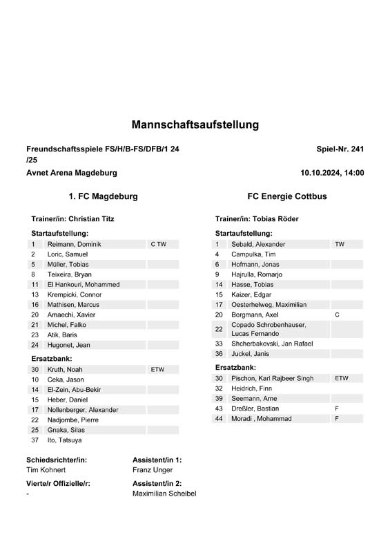 Presseinfos der 1. Mannschaft 28.06.2024, SG Burg/Spreewald (A)29.06.2024, BSV Chemie Tschernitz (A)30.06.2024, LSV Bergen 1990 (A)16.07.2024, Hertha BSC (H)19.07.2024, FSV Zwickau (H)21.07.2024, TSV Eintracht Braunschweig (A)27.07.2024, Hannover 96 II (H)04.08.2024, DSC Arminia Bielefeld (H)09.08.2024, SG Dynamo Dresden (A)19.08.2024, SV Werder Bremen (H)24.08.2024, TSV Alemannia Aachen (H)01.09.2024, SV Wehen Wiesbaden 1926 (A)06.09.2024, SV Babelsberg 03 (A)15.09.2024, SC Verl 1924 (A)21.09.2024, VfB Stuttgart 1893 II (H)24.09.2024, VfL Osnabrück 1899 (A)28.09.2024, 1. FC Saarbrücken (H)06.10.2024, Hannover 96 II (A)10.10.2024, 1. FC Magdeburg (A)19.10.2024, SV Sandhausen 1916 (H)22.10.2024, FC Erzgebirge Aue (A)27.10.2024, TSV 1860 München (H)02.11.2024, Rot-Weiss Essen (A)09.11.2024, BV Borussia 09 Dortmund II (H)16.11.2024, Oranienburger FC Eintracht 1901 (A)22.11.2024, FC Viktoria Köln 1904 (A)30.11.2024, SpVgg Unterhaching 1925 (H)07.12.2024, SV Waldhof Mannheim 07 (A)11.12.2024, SV Eintracht Alt Ruppin (A)15.12.2024, F.C. Hansa Rostock (H)20.12.2024, FC Ingolstadt 04 (A)08.01.2025, FSV Zwickau (H)11.01.2025, TSV Eintracht Braunschweig (A)18.01.2025, DSC Arminia Bielefeld (A)25.01.2025, SG Dynamo Dresden (H)31.01.2025, TSV Alemannia Aachen (A)08.02.2025, SV Wehen Wiesbaden 1926 (H)16.02.2025, SC Verl 1924 (H)23.02.2025, VfB Stuttgart 1893 II (A)01.03.2025, VfL Osnabrück 1899 (H)08.03.2025, 1. FC Saarbrücken (A)11.03.2025, Hannover 96 II (H)16.03.2025, SV Sandhausen 1916 (A)22.03.2025, RSV Eintracht 1949 (A)29.03.2025, FC Erzgebirge Aue (H)05.04.2025, TSV 1860 München (A)09.04.2025, Rot-Weiss Essen (H)13.04.2025, BV Borussia 09 Dortmund II (A)19.04.2025, FC Viktoria Köln 1904 (H)26.04.2025, SpVgg Unterhaching 1925 (A)04.05.2025, SV Waldhof Mannheim 07 (H)10.05.2025, F.C. Hansa Rostock (A)17.05.2025, FC Ingolstadt 04 (H)