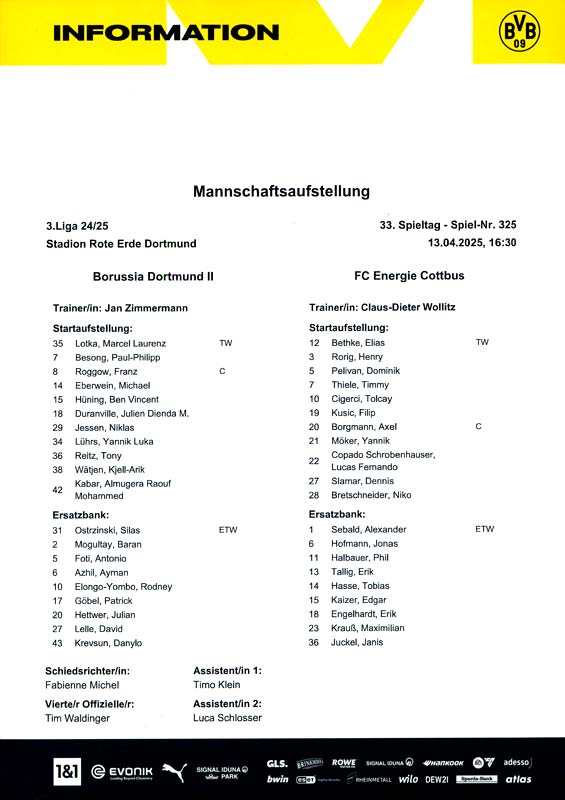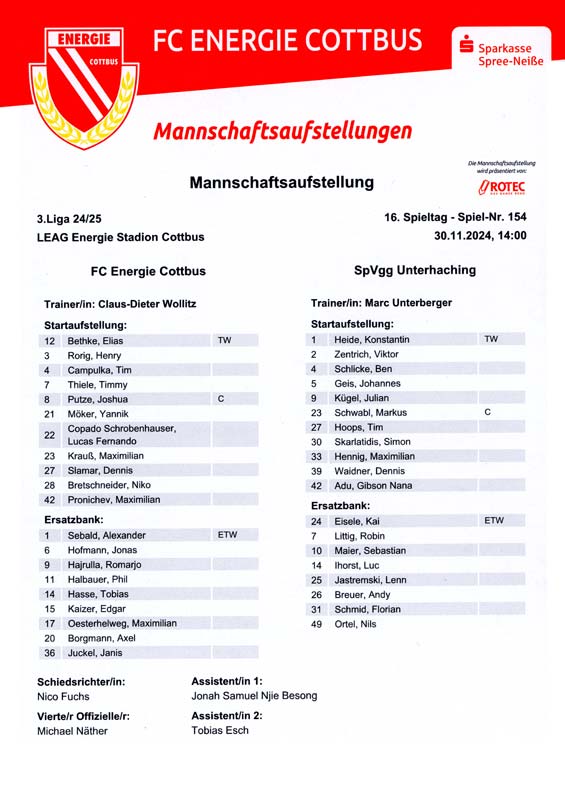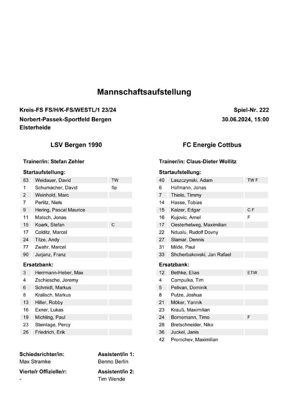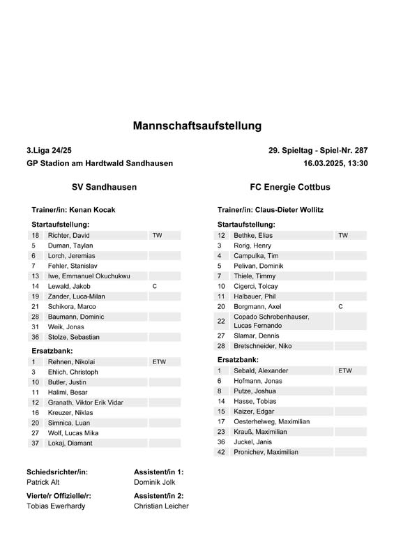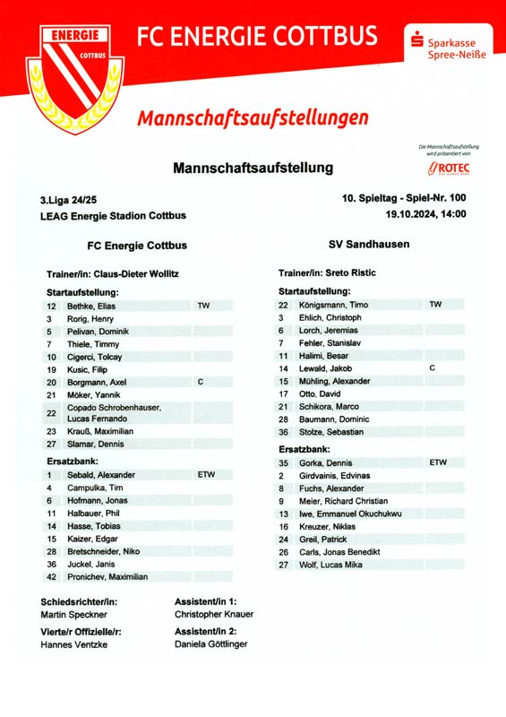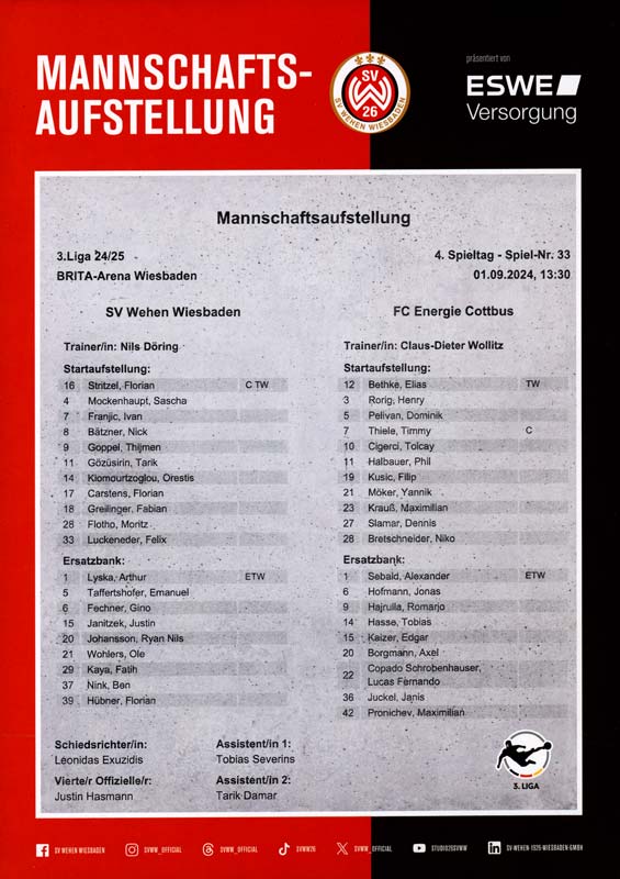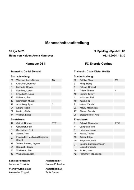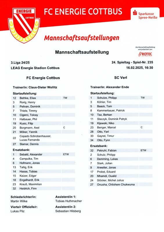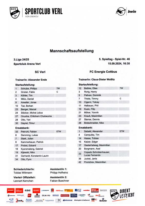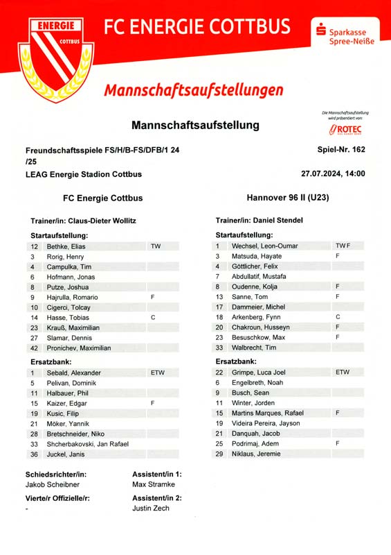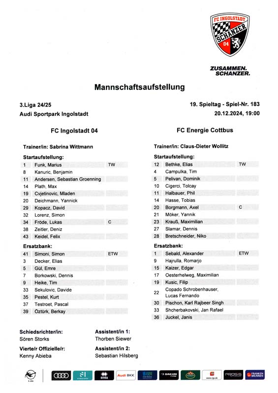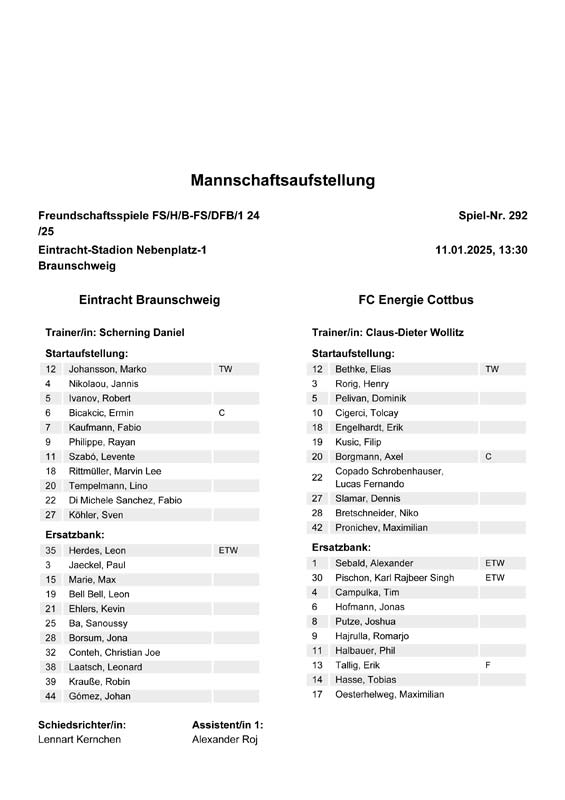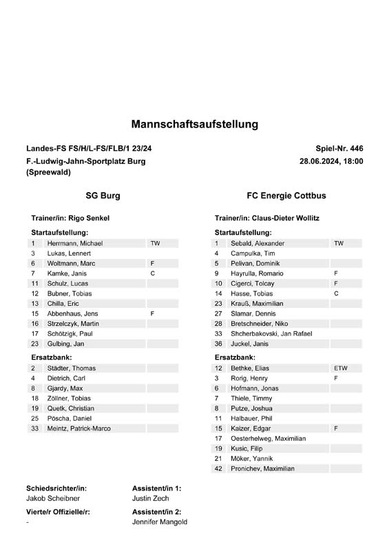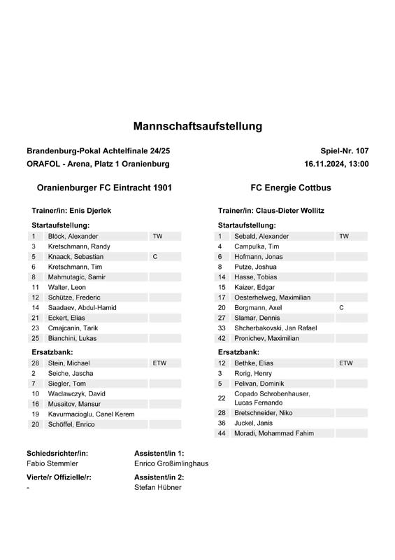 Presseinfos der 1. Mannschaft 28.06.2024, SG Burg/Spreewald (A)29.06.2024, BSV Chemie Tschernitz (A)30.06.2024, LSV Bergen 1990 (A)16.07.2024, Hertha BSC (H)19.07.2024, FSV Zwickau (H)21.07.2024, TSV Eintracht Braunschweig (A)27.07.2024, Hannover 96 II (H)04.08.2024, DSC Arminia Bielefeld (H)09.08.2024, SG Dynamo Dresden (A)19.08.2024, SV Werder Bremen (H)24.08.2024, TSV Alemannia Aachen (H)01.09.2024, SV Wehen Wiesbaden 1926 (A)06.09.2024, SV Babelsberg 03 (A)15.09.2024, SC Verl 1924 (A)21.09.2024, VfB Stuttgart 1893 II (H)24.09.2024, VfL Osnabrück 1899 (A)28.09.2024, 1. FC Saarbrücken (H)06.10.2024, Hannover 96 II (A)10.10.2024, 1. FC Magdeburg (A)19.10.2024, SV Sandhausen 1916 (H)22.10.2024, FC Erzgebirge Aue (A)27.10.2024, TSV 1860 München (H)02.11.2024, Rot-Weiss Essen (A)09.11.2024, BV Borussia 09 Dortmund II (H)16.11.2024, Oranienburger FC Eintracht 1901 (A)22.11.2024, FC Viktoria Köln 1904 (A)30.11.2024, SpVgg Unterhaching 1925 (H)07.12.2024, SV Waldhof Mannheim 07 (A)11.12.2024, SV Eintracht Alt Ruppin (A)15.12.2024, F.C. Hansa Rostock (H)20.12.2024, FC Ingolstadt 04 (A)08.01.2025, FSV Zwickau (H)11.01.2025, TSV Eintracht Braunschweig (A)18.01.2025, DSC Arminia Bielefeld (A)25.01.2025, SG Dynamo Dresden (H)31.01.2025, TSV Alemannia Aachen (A)08.02.2025, SV Wehen Wiesbaden 1926 (H)16.02.2025, SC Verl 1924 (H)23.02.2025, VfB Stuttgart 1893 II (A)01.03.2025, VfL Osnabrück 1899 (H)08.03.2025, 1. FC Saarbrücken (A)11.03.2025, Hannover 96 II (H)16.03.2025, SV Sandhausen 1916 (A)22.03.2025, RSV Eintracht 1949 (A)29.03.2025, FC Erzgebirge Aue (H)05.04.2025, TSV 1860 München (A)09.04.2025, Rot-Weiss Essen (H)13.04.2025, BV Borussia 09 Dortmund II (A)19.04.2025, FC Viktoria Köln 1904 (H)26.04.2025, SpVgg Unterhaching 1925 (A)04.05.2025, SV Waldhof Mannheim 07 (H)10.05.2025, F.C. Hansa Rostock (A)17.05.2025, FC Ingolstadt 04 (H)