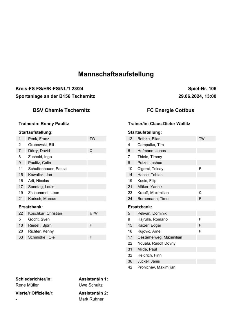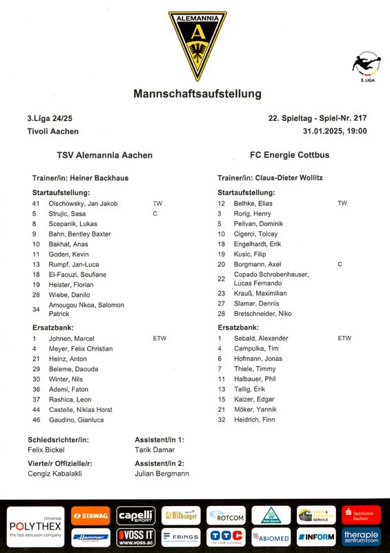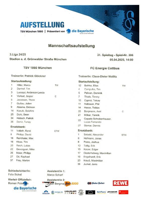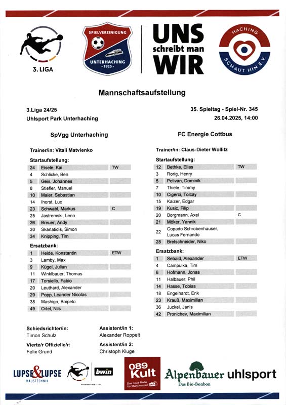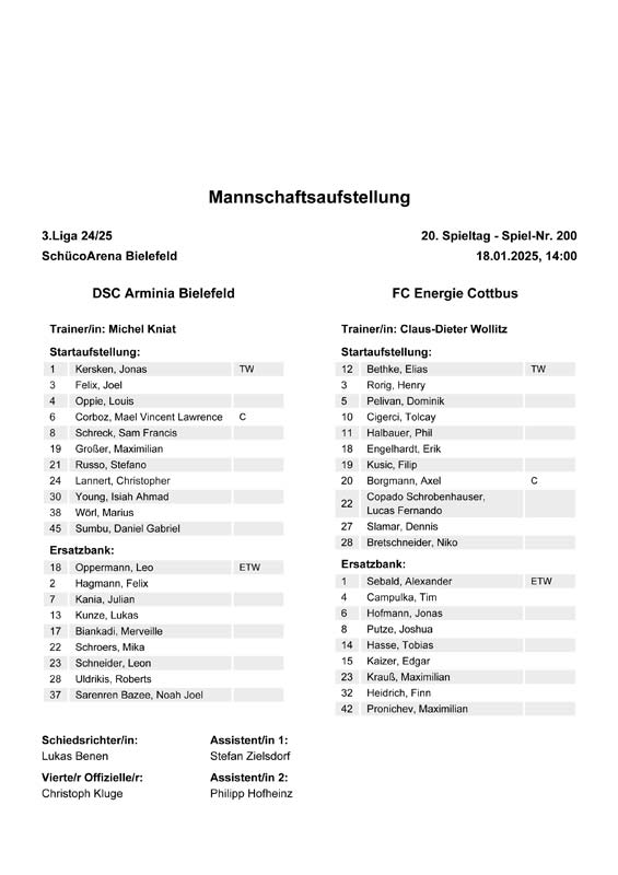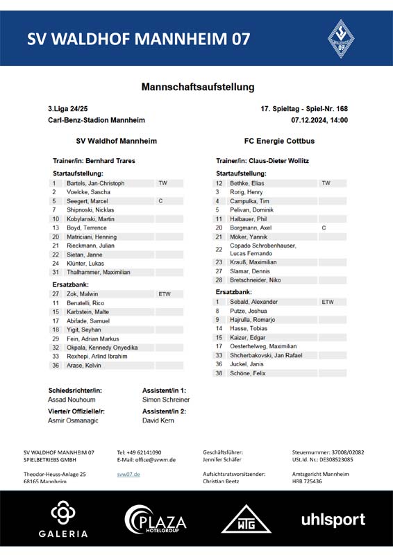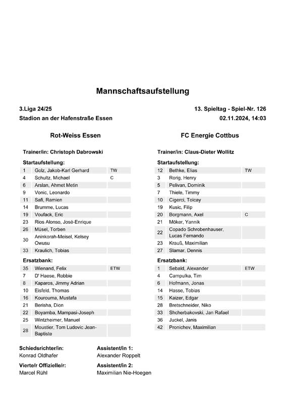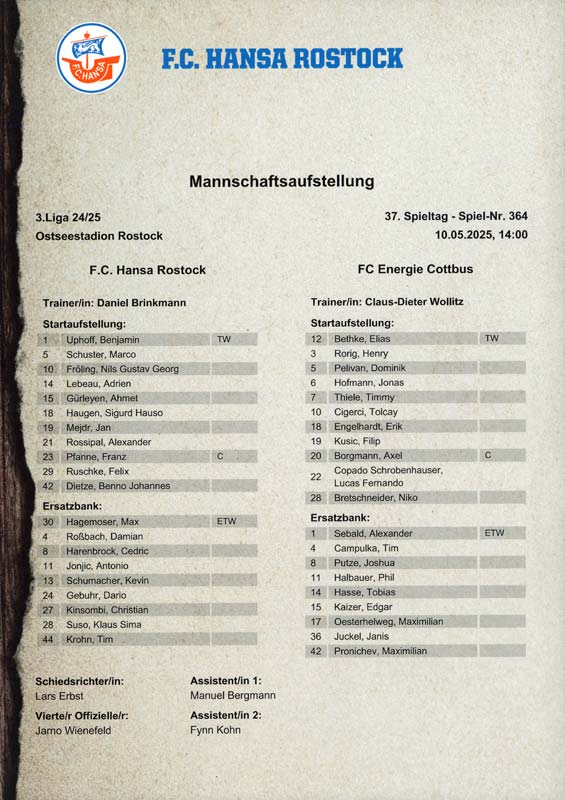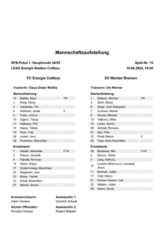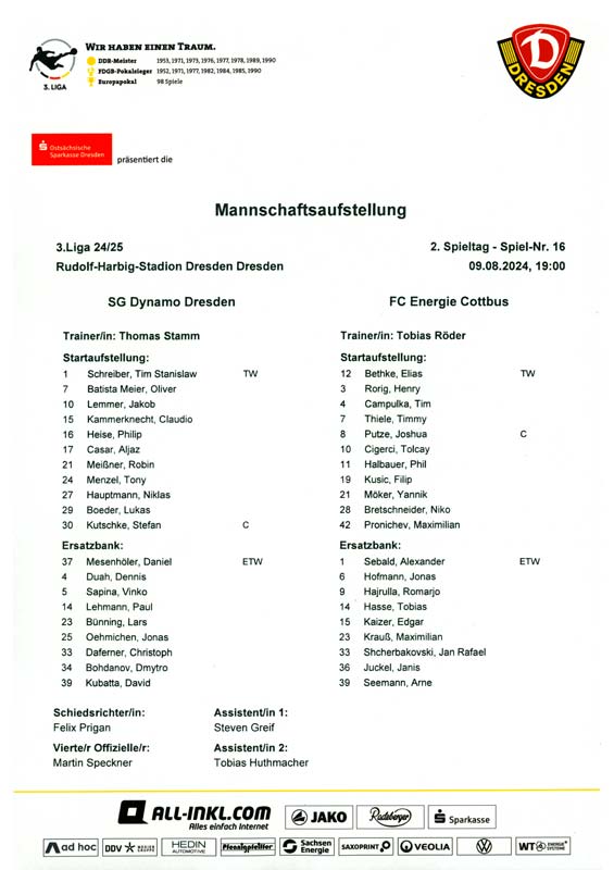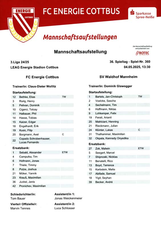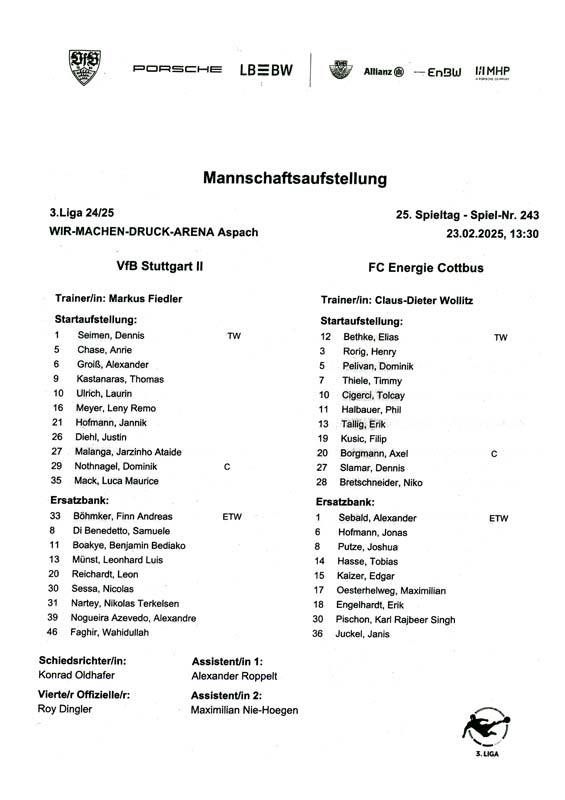 Presseinfos der 1. Mannschaft 28.06.2024, SG Burg/Spreewald (A)29.06.2024, BSV Chemie Tschernitz (A)30.06.2024, LSV Bergen 1990 (A)16.07.2024, Hertha BSC (H)19.07.2024, FSV Zwickau (H)21.07.2024, TSV Eintracht Braunschweig (A)27.07.2024, Hannover 96 II (H)04.08.2024, DSC Arminia Bielefeld (H)09.08.2024, SG Dynamo Dresden (A)19.08.2024, SV Werder Bremen (H)24.08.2024, TSV Alemannia Aachen (H)01.09.2024, SV Wehen Wiesbaden 1926 (A)06.09.2024, SV Babelsberg 03 (A)15.09.2024, SC Verl 1924 (A)21.09.2024, VfB Stuttgart 1893 II (H)24.09.2024, VfL Osnabrück 1899 (A)28.09.2024, 1. FC Saarbrücken (H)06.10.2024, Hannover 96 II (A)10.10.2024, 1. FC Magdeburg (A)19.10.2024, SV Sandhausen 1916 (H)22.10.2024, FC Erzgebirge Aue (A)27.10.2024, TSV 1860 München (H)02.11.2024, Rot-Weiss Essen (A)09.11.2024, BV Borussia 09 Dortmund II (H)16.11.2024, Oranienburger FC Eintracht 1901 (A)22.11.2024, FC Viktoria Köln 1904 (A)30.11.2024, SpVgg Unterhaching 1925 (H)07.12.2024, SV Waldhof Mannheim 07 (A)11.12.2024, SV Eintracht Alt Ruppin (A)15.12.2024, F.C. Hansa Rostock (H)20.12.2024, FC Ingolstadt 04 (A)08.01.2025, FSV Zwickau (H)11.01.2025, TSV Eintracht Braunschweig (A)18.01.2025, DSC Arminia Bielefeld (A)25.01.2025, SG Dynamo Dresden (H)31.01.2025, TSV Alemannia Aachen (A)08.02.2025, SV Wehen Wiesbaden 1926 (H)16.02.2025, SC Verl 1924 (H)23.02.2025, VfB Stuttgart 1893 II (A)01.03.2025, VfL Osnabrück 1899 (H)08.03.2025, 1. FC Saarbrücken (A)11.03.2025, Hannover 96 II (H)16.03.2025, SV Sandhausen 1916 (A)22.03.2025, RSV Eintracht 1949 (A)29.03.2025, FC Erzgebirge Aue (H)05.04.2025, TSV 1860 München (A)09.04.2025, Rot-Weiss Essen (H)13.04.2025, BV Borussia 09 Dortmund II (A)19.04.2025, FC Viktoria Köln 1904 (H)26.04.2025, SpVgg Unterhaching 1925 (A)04.05.2025, SV Waldhof Mannheim 07 (H)10.05.2025, F.C. Hansa Rostock (A)17.05.2025, FC Ingolstadt 04 (H)