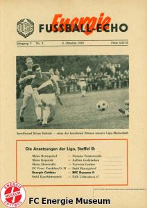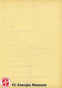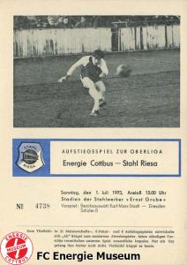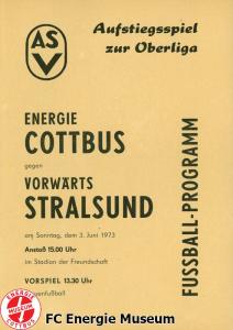 Programme der 1. Mannschaft 19.08.1972, ASG Vorwärts Cottbus (H)24.09.1972, SG Dynamo Fürstenwalde (H)08.10.1972, BFC Dynamo II (H)29.10.1972, FC Vorwärts Frankfurt (Oder) II (H)26.11.1972, BSG Motor Eberswalde (H)03.12.1972, ASG Vorwärts Cottbus (A)10.12.1972, BSG Motor Köpenick (H)11.03.1973, BSG Aufbau Großräschen (H)25.03.1973, BSG Stahl Hennigsdorf (H)08.04.1973, BSG EAB Lichtenberg 47 (H)15.04.1973, BSG Stahl Eisenhüttenstadt (H)29.04.1973, BSG Motor Hennigsdorf (H)01.05.1973, BSG Motor Köpenick (A)06.05.1973, ASG Vorwärts Leipzig (H)13.05.1973, BSG Chemie Zeitz (A)26.05.1973, BSG Stahl Riesa (H)03.06.1973, ASG Vorwärts Stralsund (A)17.06.1973, BSG Chemie Zeitz (H)01.07.1973, BSG Stahl Riesa (A)07.07.1973, ASG Vorwärts Stralsund (H)