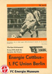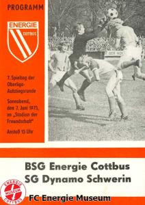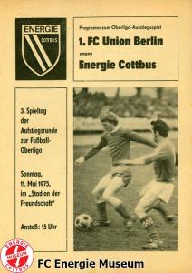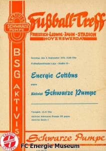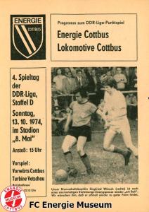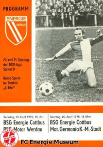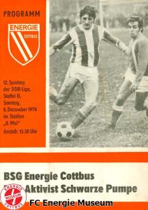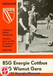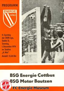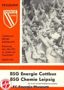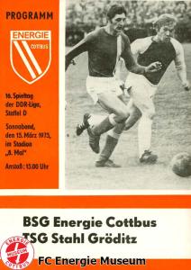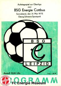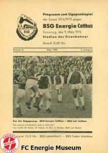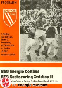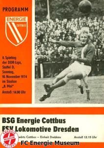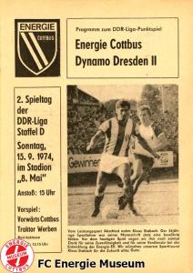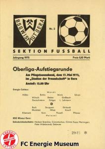 Programme der 1. Mannschaft 08.09.1974, BSG Aktivist Schwarze Pumpe (A)15.09.1974, SG Dynamo Dresden II (H)13.10.1974, BSG Lokomotive Cottbus (H)26.10.1974, BSG Sachsenring Zwickau II (H)02.11.1974, BSG Aktivist Brieske-Senftenberg (A)10.11.1974, FSV Lokomotive Dresden (H)16.11.1974, BSG Motor Werdau (A)01.12.1974, BSG Motor Bautzen (H)08.12.1974, BSG Aktivist Schwarze Pumpe (H)02.03.1975, BSG Wismut Aue II (H)09.03.1975, BSG Lokomotive Cottbus (A)15.03.1975, TSG Gröditz (H)30.03.1975, BSG Aktivist Brieske-Senftenberg (H)13.04.1975, BSG Motor Werdau (H)20.04.1975, BSG Motor Germania Karl-Marx-Stadt (H)01.05.1975, BSG Chemie Leipzig (H)11.05.1975, 1. FC Union Berlin (H)17.05.1975, BSG Wismut Gera (A)31.05.1975, BSG Chemie Leipzig (A)07.06.1975, SG Dynamo Schwerin (H)15.06.1975, 1. FC Union Berlin (A)21.06.1975, BSG Wismut Gera (H)