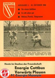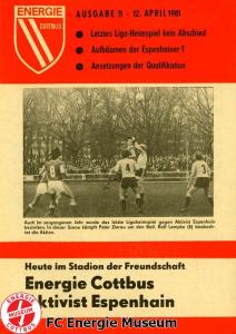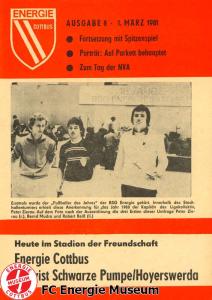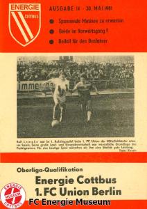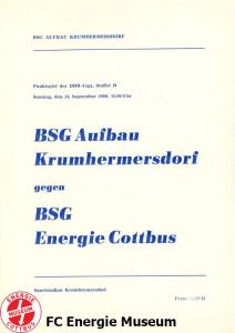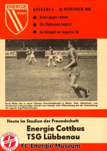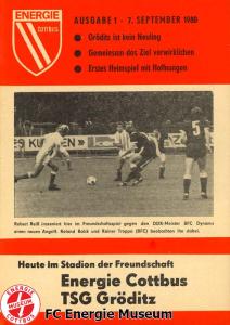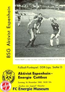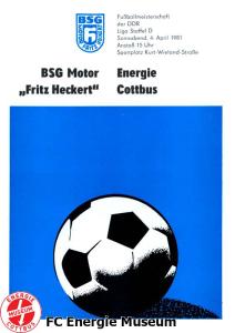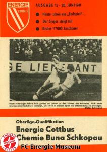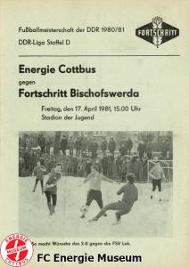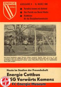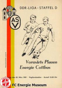 Programme der 1. Mannschaft 31.08.1980, TSG Lübbenau (A)07.09.1980, TSG Gröditz (H)14.09.1980, BSG Aufbau Krumhermersdorf (A)21.09.1980, BSG Aktivist Schwarze Pumpe (A)04.10.1980, BSG Motor Werdau (H)07.10.1980, ASG Vorwärts Kamenz (A)19.10.1980, ASG Vorwärts Plauen (H)09.11.1980, BSG Motor Fritz Heckert Karl-Marx-Stadt (H)16.11.1980, BSG Aktivist Espenhain (A)23.11.1980, BSG Fortschritt Bischofswerda (H)30.11.1980, TSG Lübbenau (H)13.12.1980, BSG Aufbau Krumhermersdorf (H)01.03.1981, BSG Aktivist Schwarze Pumpe (H)15.03.1981, ASG Vorwärts Kamenz (H)22.03.1981, ASG Vorwärts Plauen (A)29.03.1981, FSV Lokomotive Dresden (H)04.04.1981, BSG Motor Fritz Heckert Karl-Marx-Stadt (A)12.04.1981, BSG Aktivist Espenhain (H)17.04.1981, BSG Fortschritt Bischofswerda (A)26.04.1981, 1. FC Union Berlin (A)10.05.1981, BSG Schiffahrt/Hafen Rostock (H)16.05.1981, BSG Chemie Buna Schkopau (A)24.05.1981, BSG Motor Suhl (H)30.05.1981, 1. FC Union Berlin (H)13.06.1981, BSG Schiffahrt/Hafen Rostock (A)20.06.1981, BSG Chemie Buna Schkopau (H)27.06.1981, BSG Motor Suhl (A)