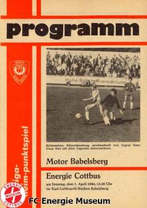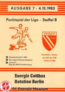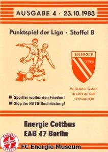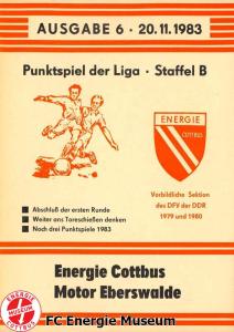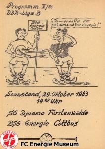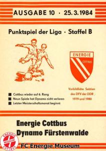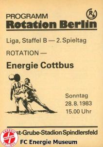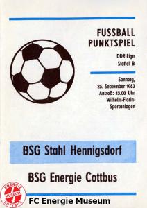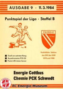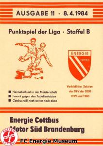 Programme der 1. Mannschaft 21.08.1983, BSG Stahl Eisenhüttenstadt (H)28.08.1983, BSG Rotation Berlin (A)11.09.1983, BSG Chemie Premnitz (H)25.09.1983, BSG Stahl Hennigsdorf (A)02.10.1983, BSG Stahl Brandenburg (H)08.10.1983, BSG Chemie PCK Schwedt (A)23.10.1983, BSG EAB Berlin 47 (H)29.10.1983, SG Dynamo Fürstenwalde (A)06.11.1983, BSG Motor Babelsberg (H)20.11.1983, BSG Motor Eberswalde (H)27.11.1983, BSG Stahl Eisenhüttenstadt (A)04.12.1983, BSG Rotation Berlin (H)26.02.1984, BSG Stahl Hennigsdorf (H)04.03.1984, BSG Stahl Brandenburg (A)11.03.1984, BSG Chemie PCK Schwedt (H)25.03.1984, SG Dynamo Fürstenwalde (H)01.04.1984, BSG Motor Babelsberg (A)08.04.1984, BSG Motor Süd Brandenburg (H)