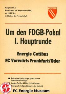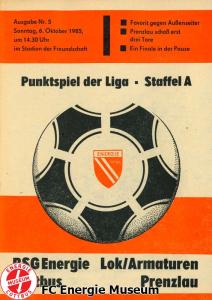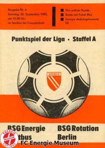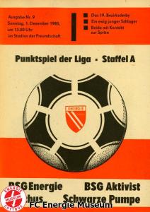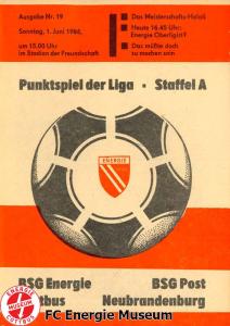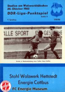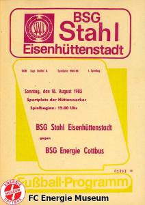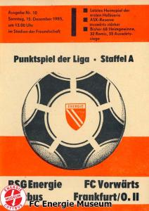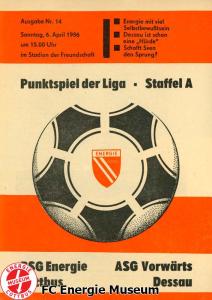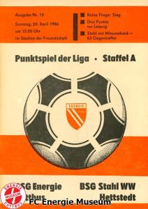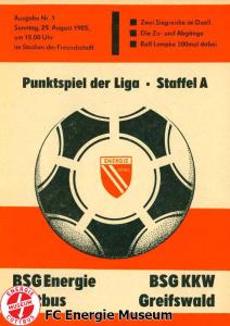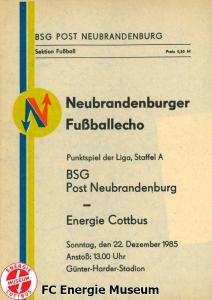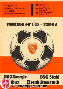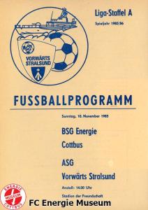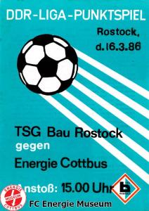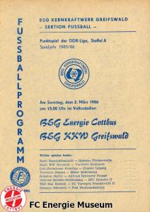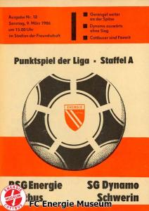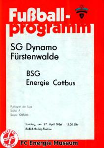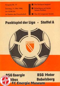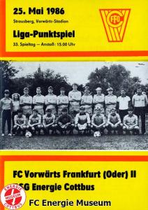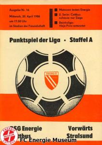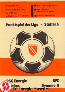 Programme der 1. Mannschaft 18.08.1985, BSG Stahl Eisenhüttenstadt (A)25.08.1985, BSG KKW Greifswald (H)01.09.1985, SG Dynamo Schwerin (A)04.09.1985, TSG Bau Rostock (H)07.09.1985, BSG Aktivist Brieske-Senftenberg (A)14.09.1985, FC Vorwärts Frankfurt (Oder) (H)22.09.1985, BSG Rotation Berlin (H)29.09.1985, ASG Vorwärts Dessau (A)06.10.1985, BSG Lok/Armaturen Prenzlau (H)12.10.1985, FC Rot-Weiß Erfurt (H)20.10.1985, BSG Stahl WW Hettstedt (A)27.10.1985, SG Dynamo Fürstenwalde (H)10.11.1985, ASG Vorwärts Stralsund (A)17.11.1985, BSG Chemie Leipzig (H)24.11.1985, BSG Motor Babelsberg (A)01.12.1985, BSG Aktivist Schwarze Pumpe (H)08.12.1985, BFC Dynamo II (A)15.12.1985, FC Vorwärts Frankfurt (Oder) II (H)22.12.1985, BSG Post Neubrandenburg (A)23.02.1986, BSG Stahl Eisenhüttenstadt (H)02.03.1986, BSG KKW Greifswald (A)09.03.1986, SG Dynamo Schwerin (H)16.03.1986, TSG Bau Rostock (A)23.03.1986, BSG Aktivist Brieske-Senftenberg (H)28.03.1986, BSG Rotation Berlin (A)06.04.1986, ASG Vorwärts Dessau (H)13.04.1986, BSG Lok/Armaturen Prenzlau (A)20.04.1986, BSG Stahl WW Hettstedt (H)27.04.1986, SG Dynamo Fürstenwalde (A)30.04.1986, ASG Vorwärts Stralsund (H)04.05.1986, BSG Chemie Leipzig (A)11.05.1986, BSG Motor Babelsberg (H)17.05.1986, BSG Aktivist Schwarze Pumpe (A)21.05.1986, BFC Dynamo II (H)25.05.1986, FC Vorwärts Frankfurt (Oder) II (A)01.06.1986, BSG Post Neubrandenburg (H)