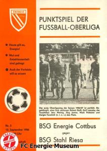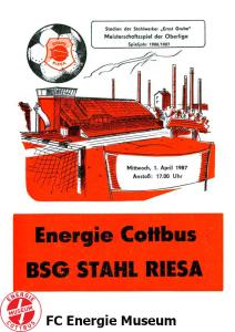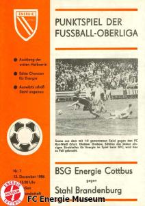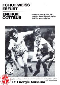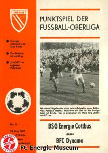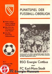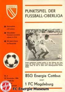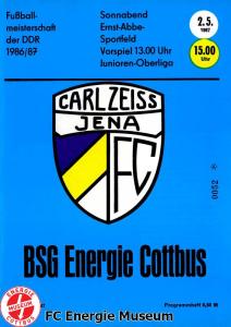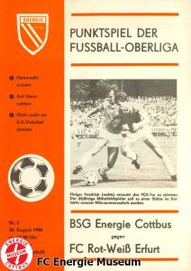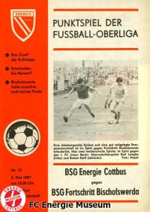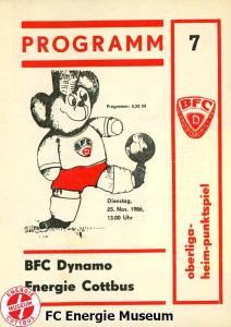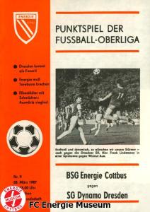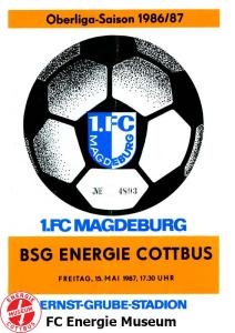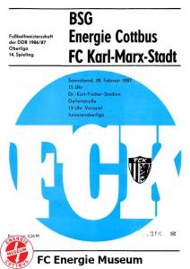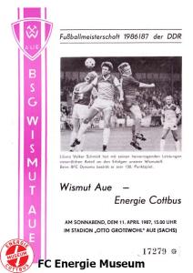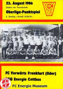 Programme der 1. Mannschaft 16.08.1986, FC Karl-Marx-Stadt (H)23.08.1986, FC Vorwärts Frankfurt (Oder) (A)30.08.1986, FC Rot-Weiß Erfurt (H)06.09.1986, SG Dynamo Dresden (A)13.09.1986, BSG Stahl Riesa (H)27.09.1986, 1. FC Union Berlin (A)04.10.1986, BSG Wismut Aue (H)11.10.1986, BSG Chemie IW Ilmenau (A)18.10.1986, 1. FC Lokomotive Leipzig (A)01.11.1986, FC Carl Zeiss Jena (H)12.11.1986, BSG Fortschritt Bischofswerda (A)22.11.1986, 1. FC Magdeburg (H)25.11.1986, BFC Dynamo (A)13.12.1986, BSG Stahl Brandenburg (H)28.02.1987, FC Karl-Marx-Stadt (A)07.03.1987, FC Vorwärts Frankfurt (Oder) (H)14.03.1987, FC Rot-Weiß Erfurt (A)28.03.1987, SG Dynamo Dresden (H)01.04.1987, BSG Stahl Riesa (A)04.04.1987, 1. FC Union Berlin (H)11.04.1987, BSG Wismut Aue (A)18.04.1987, 1. FC Lokomotive Leipzig (H)02.05.1987, FC Carl Zeiss Jena (A)09.05.1987, BSG Fortschritt Bischofswerda (H)15.05.1987, 1. FC Magdeburg (A)23.05.1987, BFC Dynamo (H)06.06.1987, BSG Stahl Brandenburg (A)