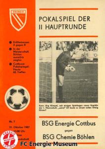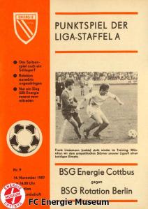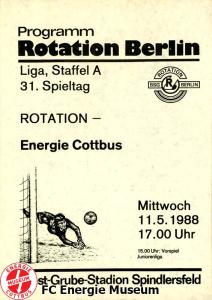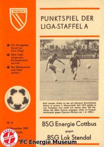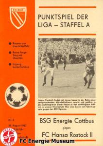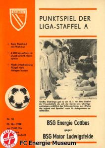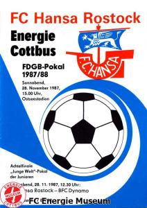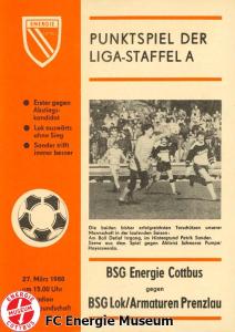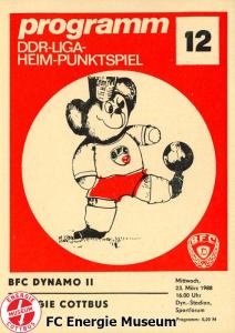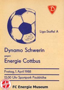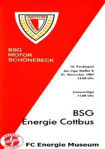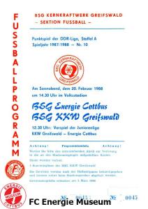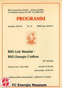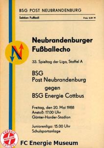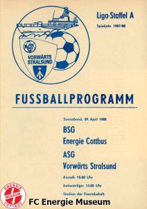 Programme der 1. Mannschaft 08.08.1987, BSG KKW Greifswald (H)15.08.1987, SG Dynamo Fürstenwalde (A)19.08.1987, BFC Dynamo II (H)22.08.1987, BSG Aktivist Schwarze Pumpe (A)29.08.1987, F.C. Hansa Rostock II (H)06.09.1987, BSG Lok/Armaturen Prenzlau (A)19.09.1987, SG Dynamo Schwerin (H)27.09.1987, BSG Motor Babelsberg (A)03.10.1987, ASG Vorwärts Stralsund (H)11.10.1987, FC Vorwärts Frankfurt (Oder) II (A)17.10.1987, BSG Stahl Eisenhüttenstadt (H)24.10.1987, BSG Aktivist Brieske-Senftenberg (A)31.10.1987, BSG Chemie Böhlen (H)07.11.1987, BSG Lokomotive Stendal (H)14.11.1987, BSG Rotation Berlin (H)21.11.1987, BSG Motor Schönebeck (A)28.11.1987, F.C. Hansa Rostock (A)06.12.1987, BSG Post Neubrandenburg (H)12.12.1987, BSG Motor Ludwigsfelde (A)20.02.1988, BSG KKW Greifswald (A)27.02.1988, SG Dynamo Fürstenwalde (H)12.03.1988, BSG Aktivist Schwarze Pumpe (H)20.03.1988, F.C. Hansa Rostock II (A)23.03.1988, BFC Dynamo II (A)27.03.1988, BSG Lok/Armaturen Prenzlau (H)01.04.1988, SG Dynamo Schwerin (A)05.04.1988, BSG Motor Babelsberg (H)09.04.1988, ASG Vorwärts Stralsund (A)17.04.1988, FC Vorwärts Frankfurt (Oder) II (H)23.04.1988, BSG Stahl Eisenhüttenstadt (A)29.04.1988, BSG Aktivist Brieske-Senftenberg (H)08.05.1988, BSG Lokomotive Stendal (A)11.05.1988, BSG Rotation Berlin (A)14.05.1988, BSG Motor Schönebeck (H)20.05.1988, BSG Post Neubrandenburg (A)29.05.1988, BSG Motor Ludwigsfelde (H)