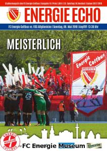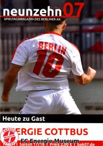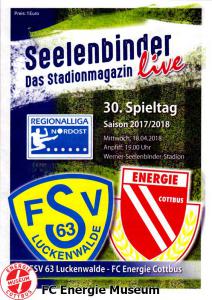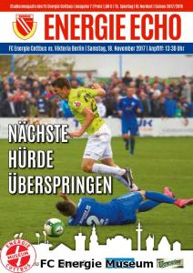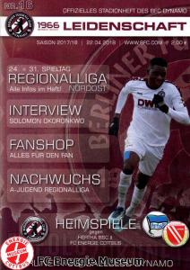 Programme der 1. Mannschaft 30.07.2017, TSG Neustrelitz (A)02.08.2017, BSG Chemie Leipzig (H)05.08.2017, FSV Budissa Bautzen (H)13.08.2017, VfB Stuttgart 1893 (H)20.08.2017, VfB Auerbach 1906 (A)23.08.2017, BSC Preußen 07 Blankenfelde-Mahlow (A)27.08.2017, ZFC Meuselwitz (H)01.09.2017, SV Falkensee-Finkenkrug (A)10.09.2017, VfB Germania Halberstadt (A)17.09.2017, BFC Dynamo (H)23.09.2017, Berliner AK 07 (A)29.09.2017, Hertha BSC II (H)03.10.2017, 1. FC Lokomotive Leipzig (A)15.10.2017, SV Babelsberg 03 (H)22.10.2017, FSV Union Fürstenwalde (A)28.10.2017, FSV 63 Luckenwalde (H)04.11.2017, FSV Wacker 90 Nordhausen (A)11.11.2017, Ludwigsfelder FC (A)18.11.2017, FC Viktoria 1889 Berlin (H)03.12.2017, FC Oberlausitz Neugersdorf (H)06.12.2017, VSG Altglienicke (A)09.12.2017, TSG Neustrelitz (H)28.01.2018, BSG Chemie Leipzig (A)04.02.2018, FSV Budissa Bautzen (A)10.02.2018, VfB Auerbach 1906 (H)24.02.2018, VfB Germania Halberstadt (H)11.03.2018, Berliner AK 07 (H)24.03.2018, FSV Union Fürstenwalde (A)28.03.2018, ZFC Meuselwitz (A)01.04.2018, 1. FC Lokomotive Leipzig (H)08.04.2018, SV Babelsberg 03 (A)15.04.2018, FSV Union Fürstenwalde (H)18.04.2018, FSV 63 Luckenwalde (A)22.04.2018, FSV Wacker 90 Nordhausen (H)25.04.2018, BFC Dynamo (A)29.04.2018, FC Viktoria 1889 Berlin (A)06.05.2018, VSG Altglienicke (H)12.05.2018, FC Oberlausitz Neugersdorf (A)21.05.2018, SV Babelsberg 03 (A)27.05.2018, SC Weiche Flensburg 08 (H)