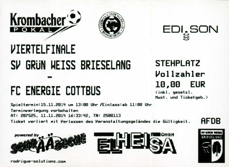 | 9. | 08.11.2014 | FSV Bernau C-Junioren () | 0:3 | FC Energie Cottbus 2. C-Junioren |