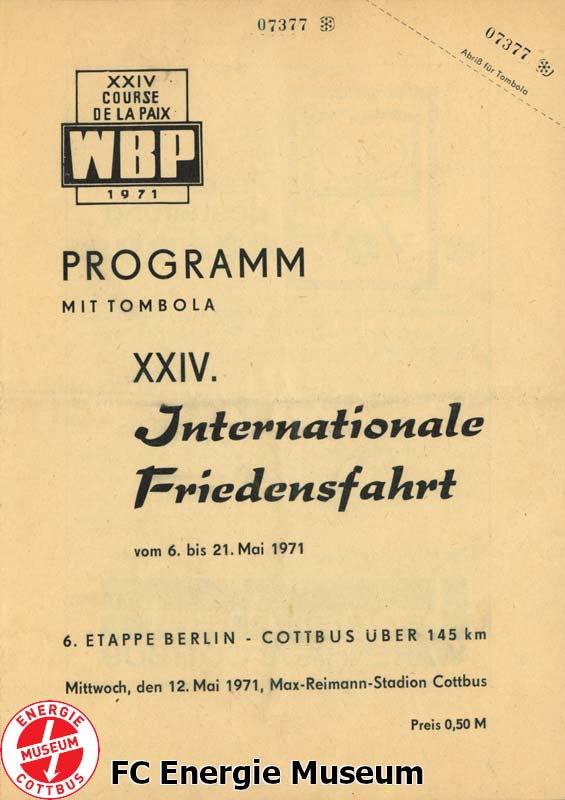 Das Spiel, vom 08.05.1970 auf den 12.05.1970 verlegt, wurde im Anschluss an die Zieleinfahrt der 6. Etappe der diesjährigen Internationalen Friedensfahrt angepfiffen. |