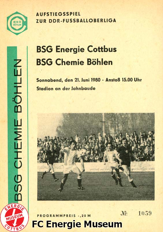 Im Stadion an der Jahnbaude besuchen an diesem 21. Juni 1980 rund 7.000 Fußballbegeisterte das Entscheidungsspiel. Den mit vielen Oberliga-erfahrenen Spielern antretenden Böhlenern reicht ein Unentschieden, um die Rückkehr in die höchste Spielklasse zu schaffen. Energie, das um die Schwere der Aufgabe weiß, beginnt das Spiel konzentriert, forciert immer wieder Ballverluste der Gastgeber und wagt häufig selbst kleine Vorstöße. Robert Reiß als Dirigent initiiert diese Angriffsbemühungen ein ums andere Mal, aber auch der agile Karl-Heinz Jahn bringt Chemie in etwaige Verlegenheiten. So auch in der 17. Minute: nach einem Pass von Peter Zierau vernascht Jahn zwei Böhlener Spieler, bringt dann den Ball an den Elfmeter-Punkt, wo Roland Balck mit einem Flachschuss zur 1:0-Führung einschiebt. Chemie Böhlen antwortet mit Offensivbemühungen, die unter anderem auch durch Standardsituationen gefährliche Ausmaße annehmen. So landet kurz vor der Pause ein Böhlener Freistoß am Pfosten. Auch zur 2. Halbzeit bekommt Energie-Keeper Rolf-Dieter Kahnt viel zu tun. Der Gastgeber setzt nun alles auf eine Karte und erzwingt schon früh im zweiten Spielabschnitt den Ausgleich (47.). Energie hält aber kämpferisch dagegen, steckt nicht auf - läuft tragischerweise aber dennoch in einen Konter und kassiert das vermeidbare 1:2 (68.).
