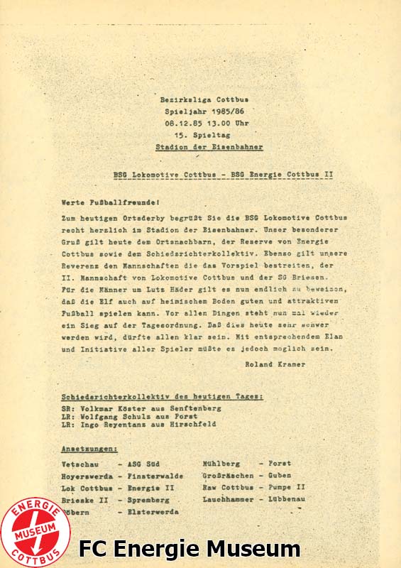 Bezirksliga Cottbus 1985/86 - 15. Spieltag Sonntag, 08.12.1985 Stadion der Eisenbahner, Cottbus 100 Zuschauer 1:2 BSG Lokomotive Cottbus (0:1) BSG Energie Cottbus II Schiedsrichter:Volkmar Köster (Senftenberg) Gegnerstatistik: BSG Lokomotive Cottbus