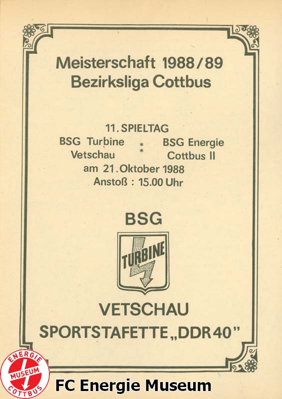 Bezirksliga Cottbus 1988/89 - 11. Spieltag Sonnabend, 22.10.1988 Turbine-Sportplatz, Vetschau 250 Zuschauer 1:1 BSG Turbine Vetschau (1:1) BSG Energie Cottbus II Schiedsrichter:Steffen Weise (Hoyerswerda) Gegnerstatistik: BSG Turbine Vetschau