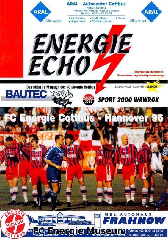 Als souveräner Meister der Regionalliga Nordost blieb dem FC Energie auch 1997 der schwere Gang über die folgenden Aufstiegsspiele nicht erspart. Die 2. Bundesliga, der Weg zum Profifußball, war sowohl für Cottbus als auch dem Nord-Meister Hannover 96 greifbar nahe. Nach einem hart umkämpften 0:0 im Niedersachsenstadion stand am 5. Juni 1997 das Rückspiel um den Aufstieg an. Schon das Hinspiel war mit 54.000 Zuschauern restlos ausverkauft. Das Rückspiel im kleineren, dafür umso lauteren, Stadion der Freundschaft war ebenfalls bis auf den letzten Platz rappelvoll gefüllt. Natürlich waren viele Fans schon durch die Pokalerfolge in jener Spielzeit solche Kulissen gewöhnt - jeder wird allerdings zugeben müssen, dass die Stimmung an diesem Tag besonders knisternd, besonders laut und unfassbar emotional war. Auf den Rängen war es ohrenbetäubend laut, es trommelte, es trötete, es wurde lautstark angefeuert. Der von Geyer vor dem Spiel geforderte "12. Mann" war da, um die Mission Aufstieg mit allen Mitteln zu erreichen. Als Schiedsrichter Georg Dardenne den Ball freigab, gab es keine einzige Sekunde, in der Stille herrschte. Energie stand den Hannoveranern von Anbeginn auf den Füßen. Um jeden Ball wurde gekämpft. Jede Grätsche von Melzig, Hoßmang und Co lautstark gefeiert. Hier stand eine Mannschaft auf dem Platz, die wollte, die biss, die ackerte und an ihre Grenzen ging. Torjäger Detlef Irrgang scheiterte nach acht beziehungsweise elf Minuten knapp am Gästekeeper. Hannover hatte hingegen nicht allzu viele Chancen, blieb dennoch über die komplette Spieldauer gefährlich. In der 40. Minute dann der Pfiff von Dardenne - Freistoß für Energie, 20 Meter vor dem Kasten. Hoßmang schnappte sich selbstsicher die Kugel. Kurzer Anlauf, Schuss, abgefälscht von einem Hannoveraner - der bange Blick und... TOR! Der Ball landete im Netz. Die Führung für Energie, der Hexenkessel brodelte, alles sprang, trötete und umarmte sich. Doch der Jubelsturm verhallte nur kurze Zeit später. Fabian Ernst hatte sich für 96 ein Herz gefasst und einfach mal aus der Distanz abgezogen. Dem sonst so sicheren Cottbuser Schlussmann Kay Wehner rutschte der Ball durch die Arme ins Tor. "Ich wollte am liebsten im Boden versinken", gab er später zu Protokoll. Dann die Halbzeit, zum Durchschnaufen, sich sammeln. Sowohl in der Kabine als auch auf den Rängen. Denn die zweite Hälfte sollte es noch mehr in sich haben. Es wurde hitziger auf dem Feld. Viele Fouls, viel Kampf, viel Stückwerk. Und dann war es auf einmal dunkel im weiten Rund. Das Flutlicht hatte sich nach etwa einer Stunde verabschiedet. Es dauerte zehn Minuten, bis die richtigen Schalter wieder umgelegt waren und Schiri Dardenne das Spiel fortsetzen konnte. Der nächste Aufreger ließ aber wieder nicht lange auf sich warten, als Melzig im Kampf um den Ball Otto Addo umsäbelte und mit Gelb-Rot in der 70. Minute vom Platz geschickt wurde. Alles sprach nun gegen Energie. Das Publikum spürte das, pfiff 96 bei jedem Ballkontakt gnadenlos aus und bejubelte nun noch mehr die eigene Mannschaft nach gelungenen Aktionen. Und dann passierte es. Der vielleicht wichtigste Moment in unserer Vereinsgeschichte. Hannover war in Überzahl weit aufgerückt, Cottbus eroberte den Ball. Über Seifert kam der Ball in den Strafraum und wurde länger und länger. Hannovers Torwart Sievers kam nicht an die Kugel, sodass Irrgang in der Mitte freistehend den Fuß ranhielt und zum 2:1 einschob! Nun brachen alle Dämme. Irrgang wurde in einer Spielertraube begraben, die Fans flogen über- und durcheinander auf den Stufen, es gab kein Halten mehr. Hannover antworte mit wütenden Angriffen, wirkte aber stark angeschlagen. Dann zappelte der Ball auf einmal hinter Wehner im Netz. Der Schock war nur von kurzer Dauer - dem Tor der 96er war ein Foulspiel vorausgegangen. Cottbus mauerte weiter in Unterzahl und kam dann doch noch mal vors Tor. Wieder war es Irrgang, der diesmal einige Abwehrbeine stehen ließ, abzog und zusah, wie Sievers zwar hielt, der Ball aber wieder genau vor Irrgangs Füße sprang. Diesen schob er eiskalt zum entscheidenden 3:1 in die Maschen. Was für eine Erlösung! Kurz darauf war Schluss. Die Menschen strömten in Scharen auf das Spielfeld und feierten ihre Helden. Ede Geyer sprach von einem verdienten Sieg: "Auch wenn Hannover geschliffener gespielt hat als wir, werden Spiele nun mal durch Tore entschieden. Und da haben wir zwei mehr gemacht als 96". Energie Cottbus war erstmals nach der Wende aufgestiegen und spielte nun im Wettbewerb der Großen mit. Dank eines denkwürdigen Auftritts an jenem Tag, der bis heute einer der wichtigsten Tage der Energie-Geschichte ist.