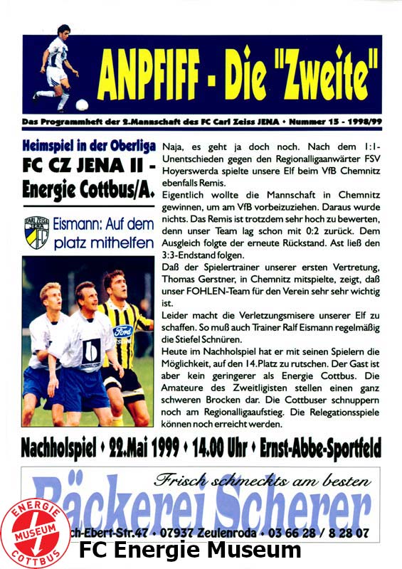 Die Begegnung wurde kurzfristig abgesagt, da dem FC Carl Zeiss Jena nicht genügend Spieler zur Verfügung standen. Aufgrund der wenig später endenden Saison wurde die Partie nicht neu angesetzt sondern am Grünen Tisch gewertet. |