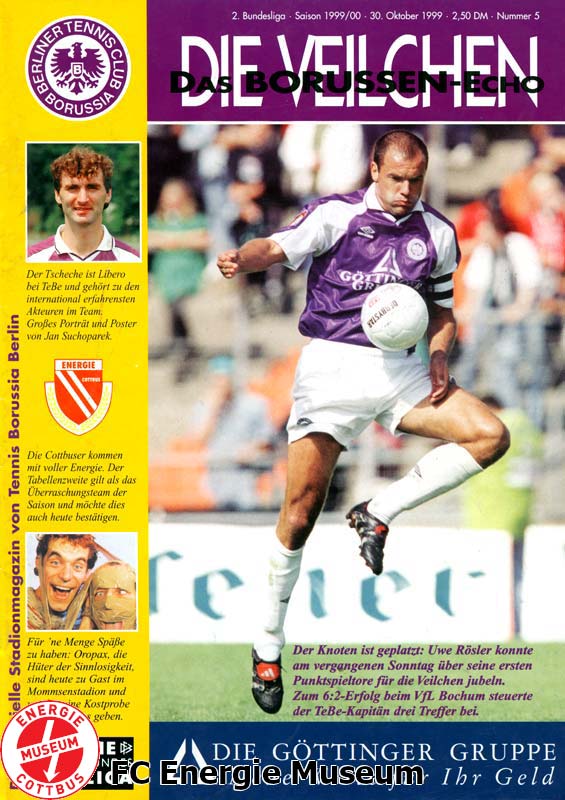 Dritter gegen Zweiter. Am 30. Oktober 1999 schaute Fußballdeutschland nach Berlin. Im Mommsenstadion hatten sich knapp 10.000 Fans beider Lager eingefunden. Und ein Name war an diesem Nachmittag in aller Munde: Uwe Rösler. TeBes Top-Angreifer wurde zum tragischen Helden in einer Partie, die das Prädikat Spitzenspiel zu Recht verdiente. „Ich habe bestimmt schon viel erlebt, aber so ein verrücktes Fußballspiel noch nie“, sagte selbst Ede Geyer nach dem Abpfiff. Aber der Reihe nach. Schon vor dem Spiel gab es Aufregung, da die zehn Cottbuser Fanbusse auf der Avus im Stau steckten. Der Anpfiff wurde daher um eine knappe Viertelstunde nach hinten verlegt. Als dann alle da waren, ging das hitzige Duell in seine erste Runde. Die favorisierten Berliner legten ordentlich los, erspielten sich Feldvorteile. Nach vier Minuten schockte Uwe Rösler die Cottbuser mit einem Lattentreffer. In der zehnten Minute dann der Jubel auf Berliner Seite: wieder war es Rösler, der den Ball diesmal in die Maschen köpfte. Doch der Schiedsrichter gab den Treffer nicht, sah ein Foul an Torhüter Piplica. Nach 18 Minuten klingelte es dann erneut im Cottbuser Kasten - nach einer Copado-Ecke nickte der wuchtige Rösler zur Berliner Führung ein. Treffer zählte - 1:0 für TeBe. Und der Favorit drückte weiter. In der 26. Minute ein überraschender Pfiff von Schiedsrichter Trautmann, der ein Halten von Rayk Schröder gegen Uwe Rösler gesehen haben wollte. Rösler trat selbst zum Elfmeter an, flacher Abschluss - und Piplica hielt den etwas zu ungenauen Schuss. Der hochmotivierte Angreifer wurde wütender und ließ seinen Frust nur eine Minute später an Alexej Kurilenko aus. Nach einem Tritt gegen den Cottbuser gab Trautmann glatt Rot. Lattentreffer, nicht gegebenes Tor, Führungstreffer, verschossener Elfer und Rot - Uwe Röslers 28 Minuten boten wahrlich viel Gesprächsstoff. Doch auch in Überzahl sahen die rund 4.000 Energiefans keine souveräne Cottbuser Mannschaft. Im Gegenteil, die TeBe-Akteure fuhren vor allem im zweiten Spielabschnitt einen gefährlichen Konter nach dem nächsten und hätten durch Copado oder Ouakili die Führung noch erhöhen müssen - was der an diesem Tag einmal mehr herausragende Tomislav Piplica zu verhindern wusste. Cottbus rappelte sich spät noch einmal auf, Geyer wechselte offensiv und ging "All-in". Der eingewechselte Franklin setzte in der 81. Minute zum Schuss an, den Hilfiker im TeBe-Tor nicht festhalten konnte. Moussa Latoundji stand goldrichtig und staubte zum Ausgleich ab. Der Jubel des Gästeanhangs war noch gar nicht vorüber, da setzte Latoundji einen Ball an die Latte - den Abpraller verwandelte Christian Beeck zur Cottbuser Führung. Nun war der Bann gebrochen und Energie setzte nach einer Labak-Hereingabe durch Vasile Miriuta den 3:1-Schlusspunkt. Ein Wahnsinns-Ende in einem verrückten Spiel bescherte Energie die Tabellenführung am zehnten Spieltag. „Wir haben uns nie aufgegeben und wurden dafür am Ende belohnt“, berichtete nach dem Abpfiff ein zufriedener Moussa Latoundji. TeBe-Trainer Winnie Schäfer sprach von einer „bitteren Niederlage, wenn man so gut spielt“. Nur einer wollte nach dem Spiel nichts mehr sagen und verschwand wortlos in den Katakomben - der tragische TeBe-Kapitän Uwe Rösler.