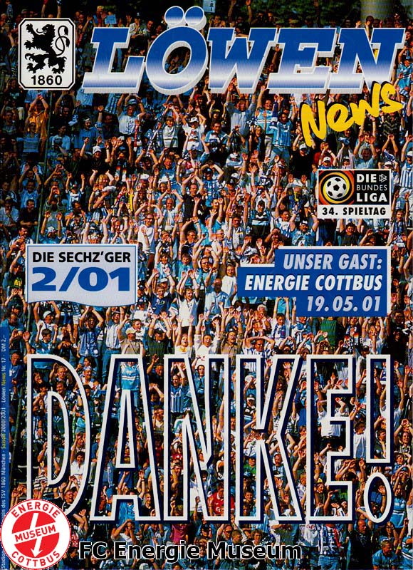 Der 19. Mai 2001 ist unbestritten einer der wichtigeren Tage in der Geschichte von Energie. Cottbus spielte bis dato eine hervorragende erste Bundesliga-Saison und konnte sich durch einen Sieg am letzten Spieltag selber retten. Der Gegner: 1860 München. Fünf Jahre später. Am 14. Mai 2006 kommt es im Stadion der Freundschaft zum alles entscheidenden Spiel um den Wiederaufstieg in die Bundesliga. McKenna, Berhalter, da Silva und Co erwarten am 34. Spieltag einen starken Gegner: die Münchener Löwen.