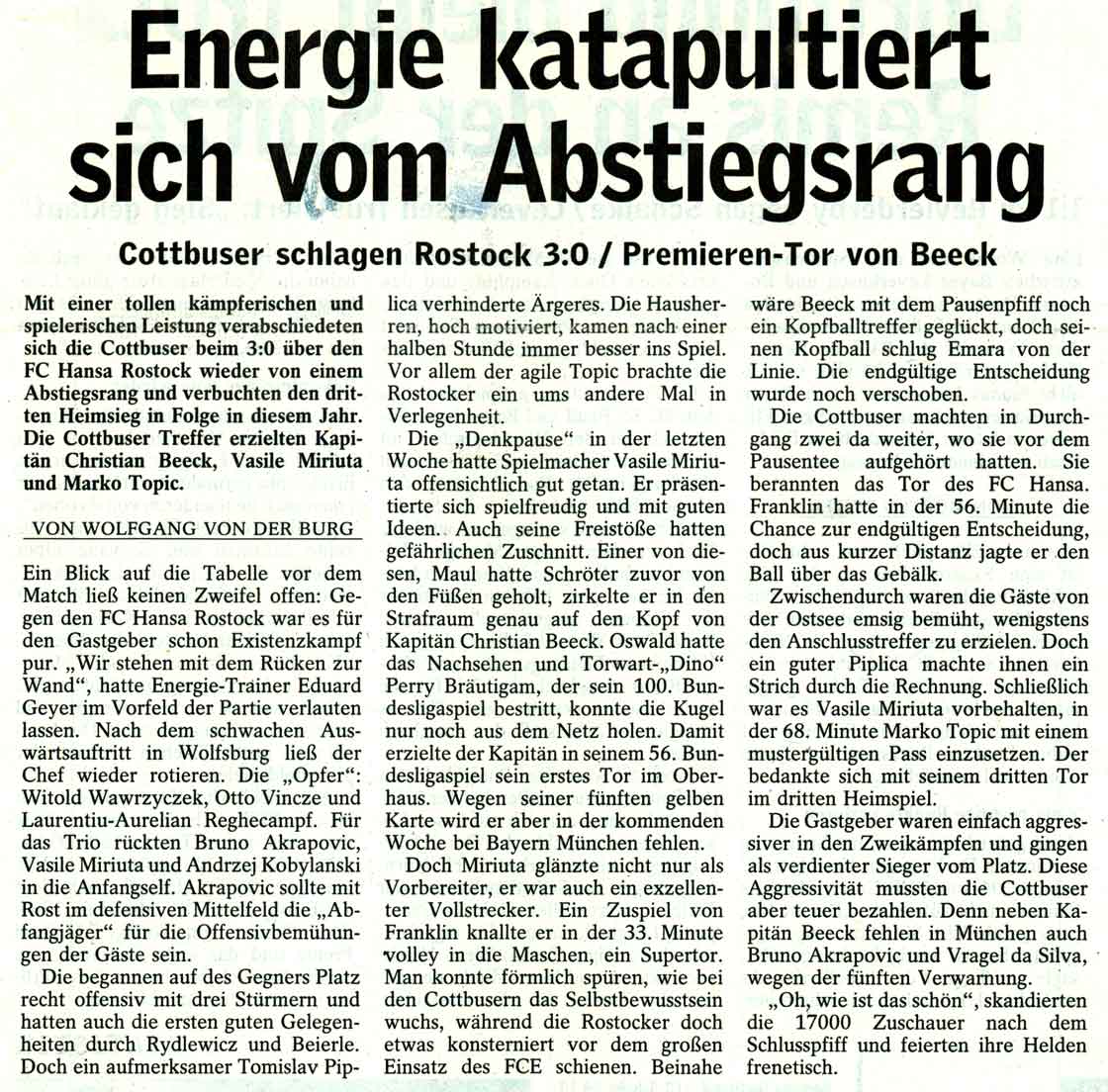 P. Bräutigam - T. Lange, A. Jakobsson, K. Oswald, M. Emara - R. Yasser , M. Lantz, R. Maul - R. Rydlewicz, M. Beierle, A. di Salvo Auswechslungen: Trainer: Armin Veh |
