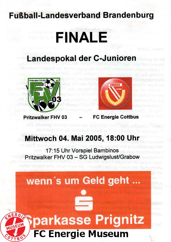 FLB-Pokal der C-Junioren 2004/05 - Finale Mittwoch, 04.05.2005 Sportplatz Hainholzweg, Pritzwalk - Zuschauer 5:6 n.E. Pritzwalker FHV 03 C-Junioren (1:1) FC Energie Cottbus 2. C-Junioren Schiedsrichter:Ingo Stolz (Silmersdorf) Gegnerstatistik: Pritzwalker FHV 03 C-Junioren