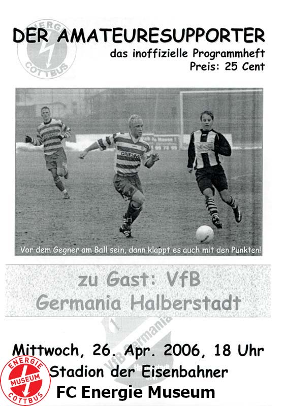 Nachholspiel. Ursprünglich sollte diese Begegnung bereits am 11.03.2006 ausgetragen werden. Wegen starker Schnellfälle waren das Südstadion sowie der Sportplatz am Priorgraben nicht bespielbar. |