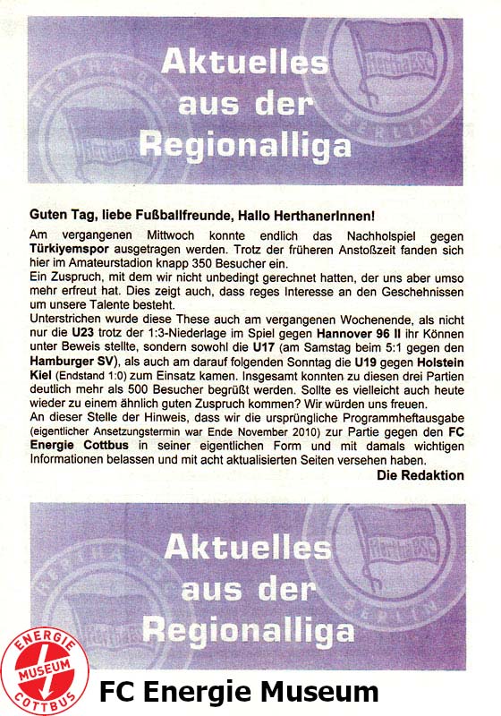 Nachholspiel. Ursprünglich sollte diese Begegnung bereits am 28.11.2010 ausgetragen werden. Wegen einer erneuten Absage am 08.12.2010 musste die Partie ein weiteres Mal verschoben werden. Grund der Absagen war jeweils die Unbespielbarkeit des Platzes nach starken Schneefällen. |