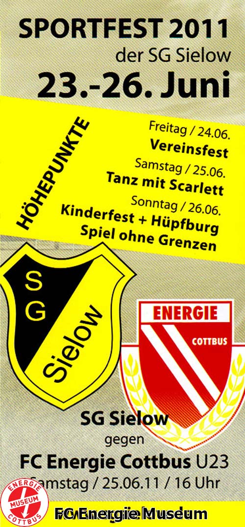 Testspiel 2011/12 Sonnabend, 25.06.2011 Friedrich-Ludwig-Jahn-Sportplatz, Sielow 200 Zuschauer 0:7 SG Sielow (- : -) FC Energie Cottbus II Schiedsrichter:- Gegnerstatistik: SG Sielow