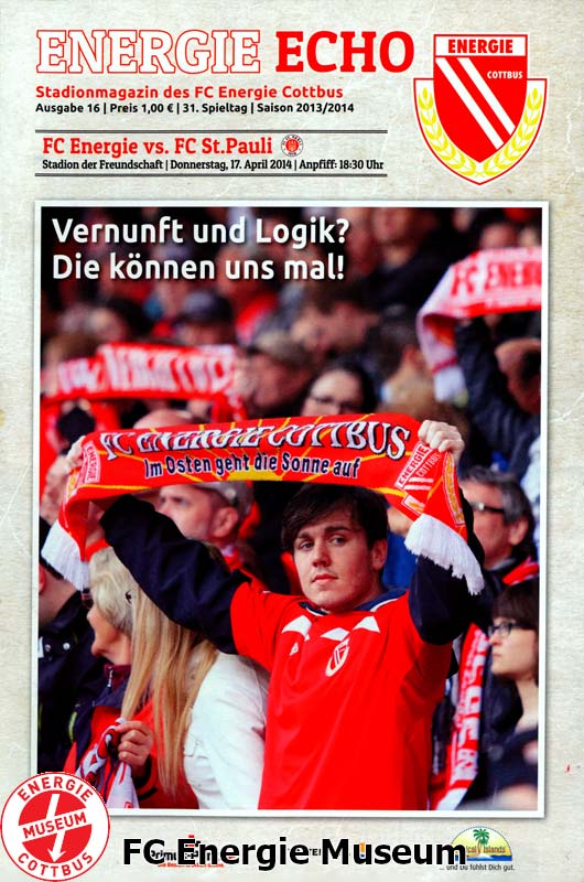 Die Nordwand im Stadion der Freundschaft war an diesem Spieltag für Zuschauer gesperrt. Grund war ein DFB-Sportgerichtsurteil nach einem Münzwurf gegen den Schiedsrichterassistenten Thomas Stein am 04.04.2014 beim Heimspiel gegen die SG Dynamo Dresden. |