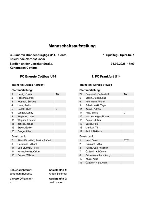 Aufstellung 1. FC Frankfurt (Oder) 2. C-Junioren |
