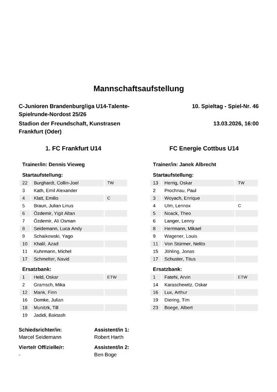 | Aufstellung 1. FC Frankfurt (Oder) 2. C-Junioren |