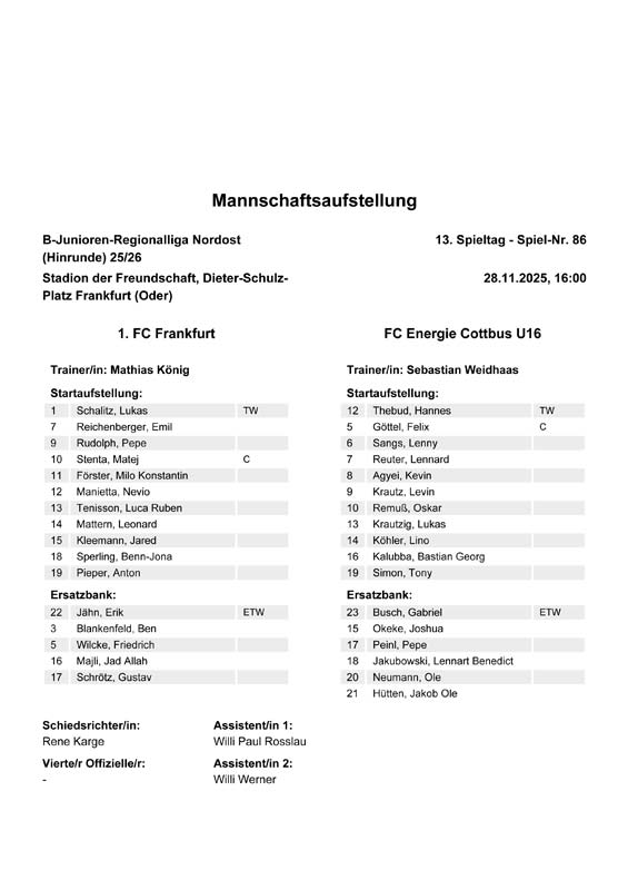 | Aufstellung 1. FC Frankfurt (Oder) B-Junioren |