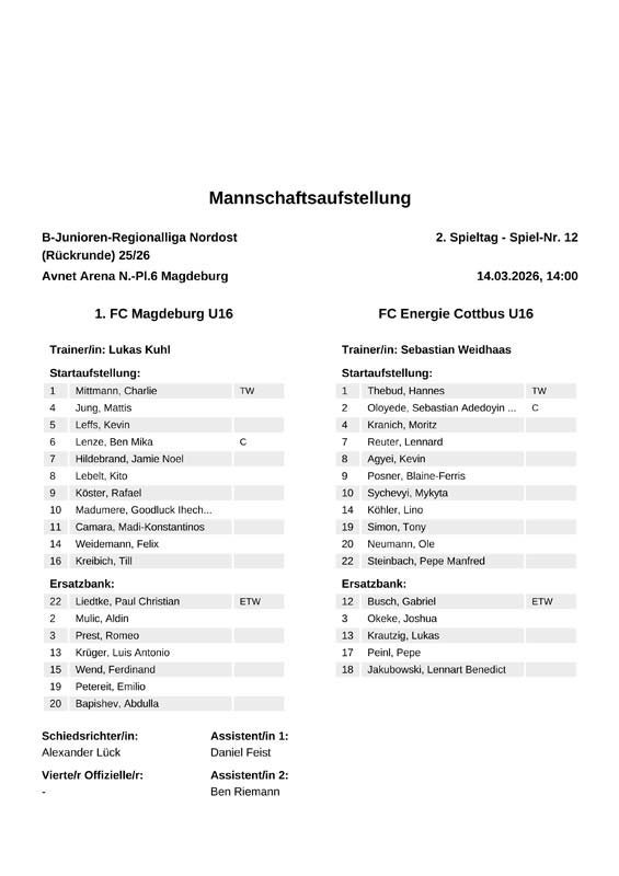 | Aufstellung 1. FC Magdeburg 2. B-Junioren |