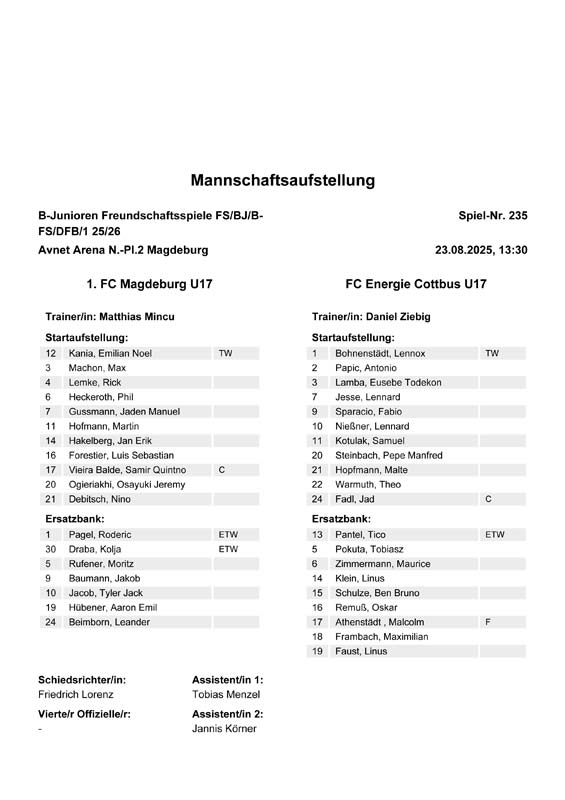 L. Bohnenstädt - A. Papic, E. Lamba, L. Jesse, F. Sparacio, L. Nießner, S. Kotulak, P. Steinbach, M. Hopfmann, T. Warmuth, J. Fadl Auswechslungen: Trainer: Daniel Ziebig |