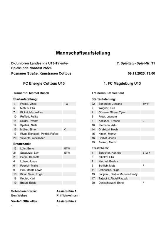 | FC Energie Cottbus D-Junioren | (1:1) | 1. FC Magdeburg D-Junioren |