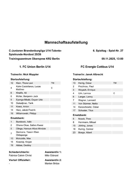 | Aufstellung 1. FC Union Berlin 2. C-Junioren |