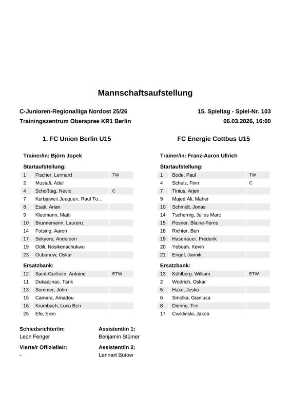 P. Bode - Fi. Schulz, A. Tinius, M. Majed Ali, Jo. Schmidt, J. Tschernig, B. Posner, Be. Richter, F. Hasenauer, K. Yeboah, J. Engel Auswechslungen: Trainer: Franz-Aaron Ullrich |