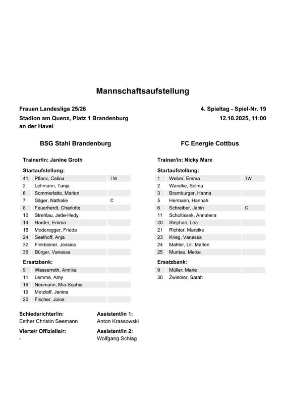 | BSG Stahl Brandenburg Frauen | (1:0) | FC Energie Cottbus Frauen |