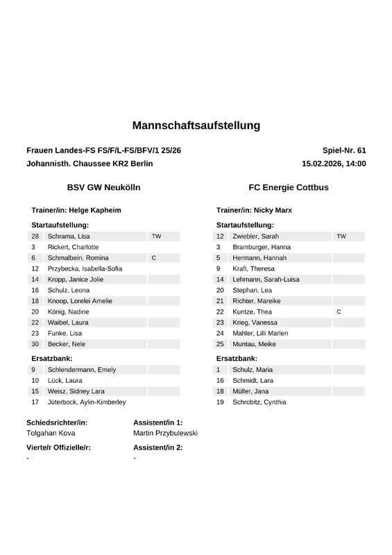 Sarah Zwiebler - Hanna Bramburger, Hannah Hermann, Theresa Kraft, Sarah-Luisa Lehmann, Lea Stephan, Mareike Richter, Thea Kuntze, Vanessa Krieg, Lilli Marlen Mahler, Meike Muntau Auswechslungen: Trainer: Nicky Marx |