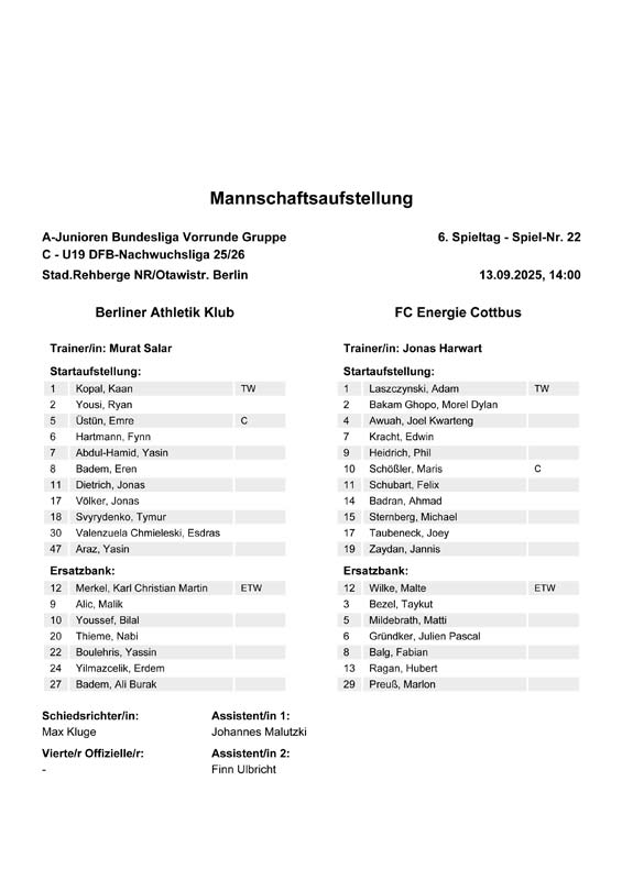 A. Laszczynski - M. Ghopo, J. Awuah, E. Kracht, P. Heidrich, M. Schößler, F. Schubart , A. Badran, M. Sternberg, J. Taubeneck, J. Zaydan Auswechslungen: Trainer: i.V. Jonas Harwart |