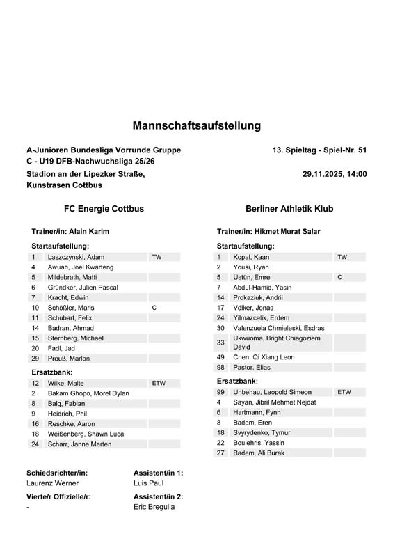 | Aufstellung FC Energie Cottbus A-Junioren |