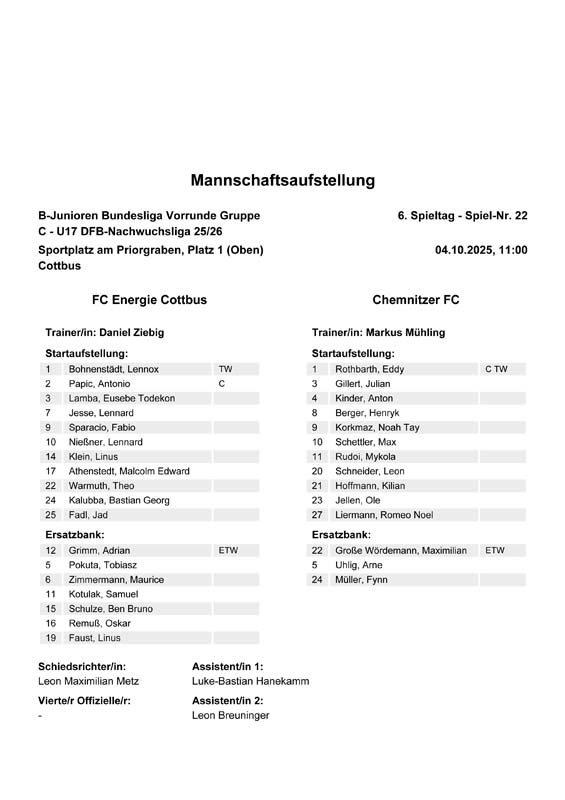 L. Bohnenstädt - A. Papic, E. Lamba, L. Jesse, F. Sparacio , L. Nießner , L. Klein, M. Athenstedt, T. Warmuth, B. Kalubba, J. Fadl Auswechslungen: Trainer: Daniel Ziebig |