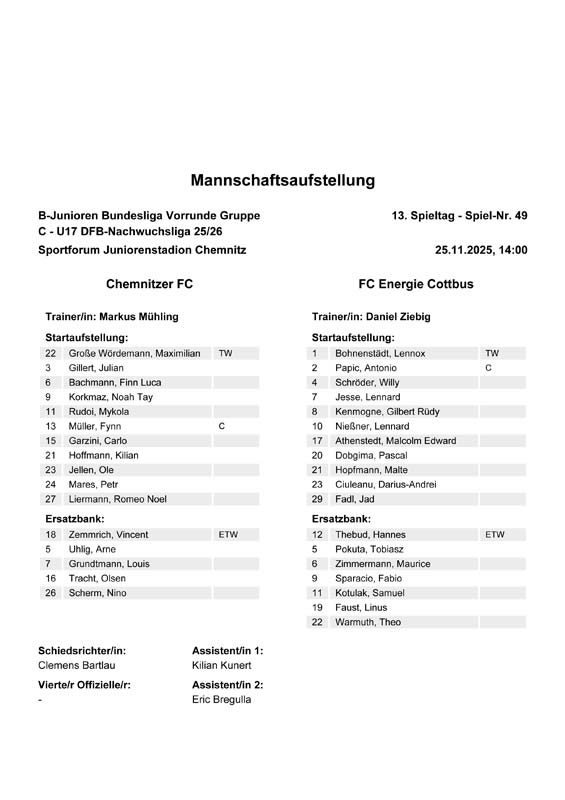 | Aufstellung Chemnitzer FC B-Junioren |