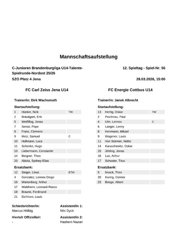 O. Herrig - P. Prochnau, L. Ulm, L. Langer, M. Herrmann , L. Wagener, N. von Stürmer, O. Karaschewitz, J. Jöhling, A. Lux, Ti. Schuster Auswechslungen: Trainer: Janek Albrecht |