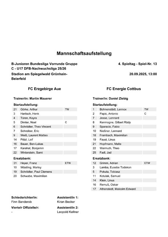 L. Bohnenstädt - A. Papic, L. Jesse, G. Kenmogne (78.), F. Sparacio, L. Nießner , M. Frambach, L. Faust , M. Hopfmann, T. Warmuth, J. Fadl Auswechslungen: Trainer: Daniel Ziebig |