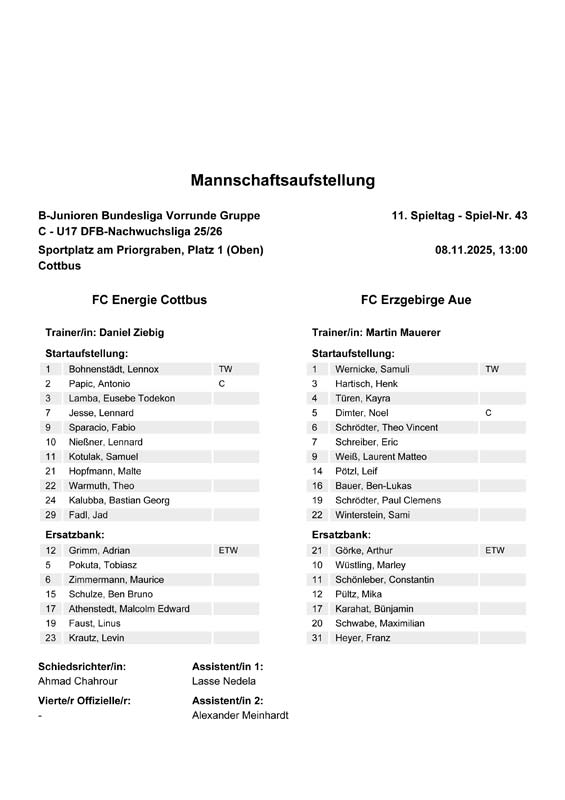 L. Bohnenstädt - A. Papic , E. Lamba, L. Jesse, F. Sparacio, L. Nießner, S. Kotulak, M. Hopfmann, T. Warmuth, B. Kalubba, J. Fadl Auswechslungen: Trainer: Daniel Ziebig |