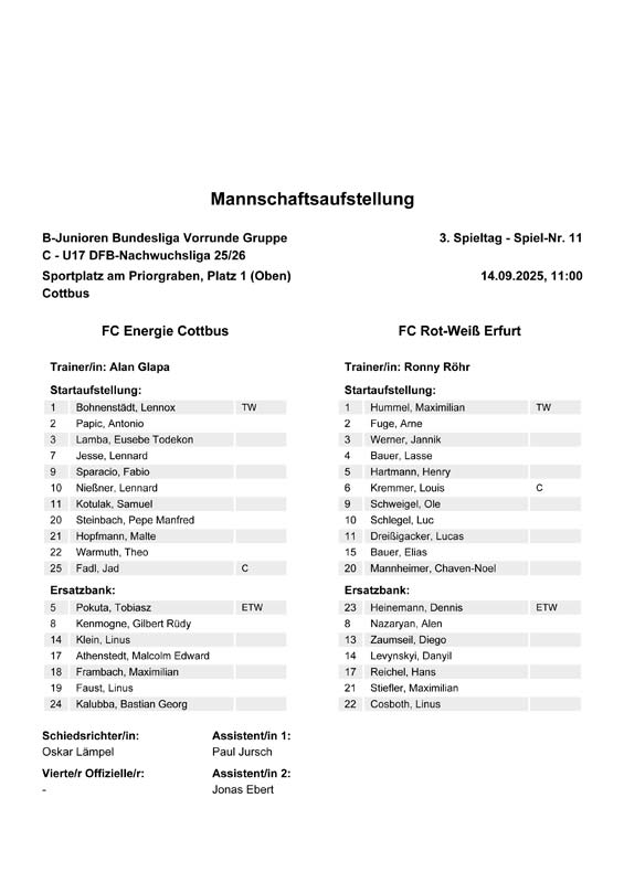 L. Bohnenstädt - A. Papic , E. Lamba, L. Jesse, F. Sparacio, L. Nießner, S. Kotulak, P. Steinbach, M. Hopfmann, T. Warmuth, J. Fadl Auswechslungen: Trainer: i.V. Alan Glapa |